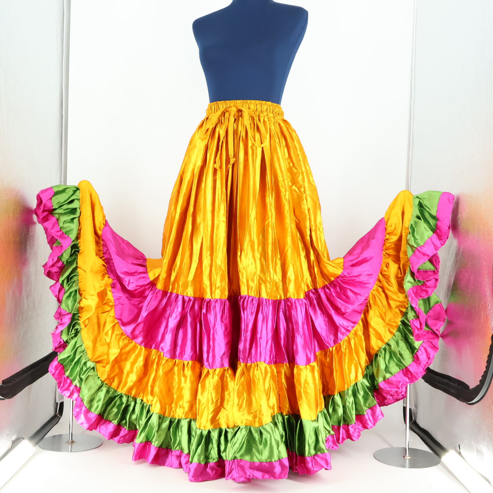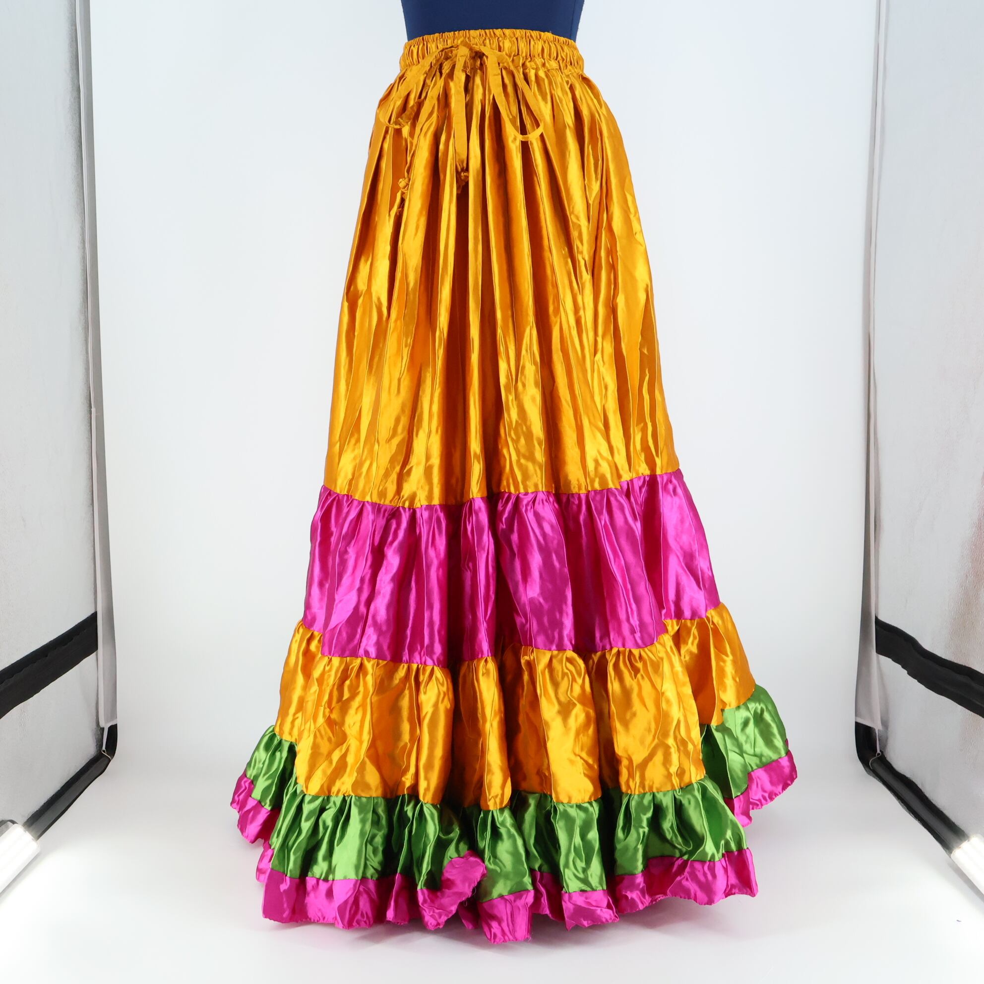 #ベリーダンス #ベリーダンス衣装 #ジプシースカート #オレンジ #ピンク #黄緑 #フリル #光沢 #艶 #鮮やか #ロングスカート #ボリューム #大きく広がる裾 #明るい色 #ダンスコスチューム #エスニックファッション #ダンス衣装 #古着 #中古 #ENUTSU