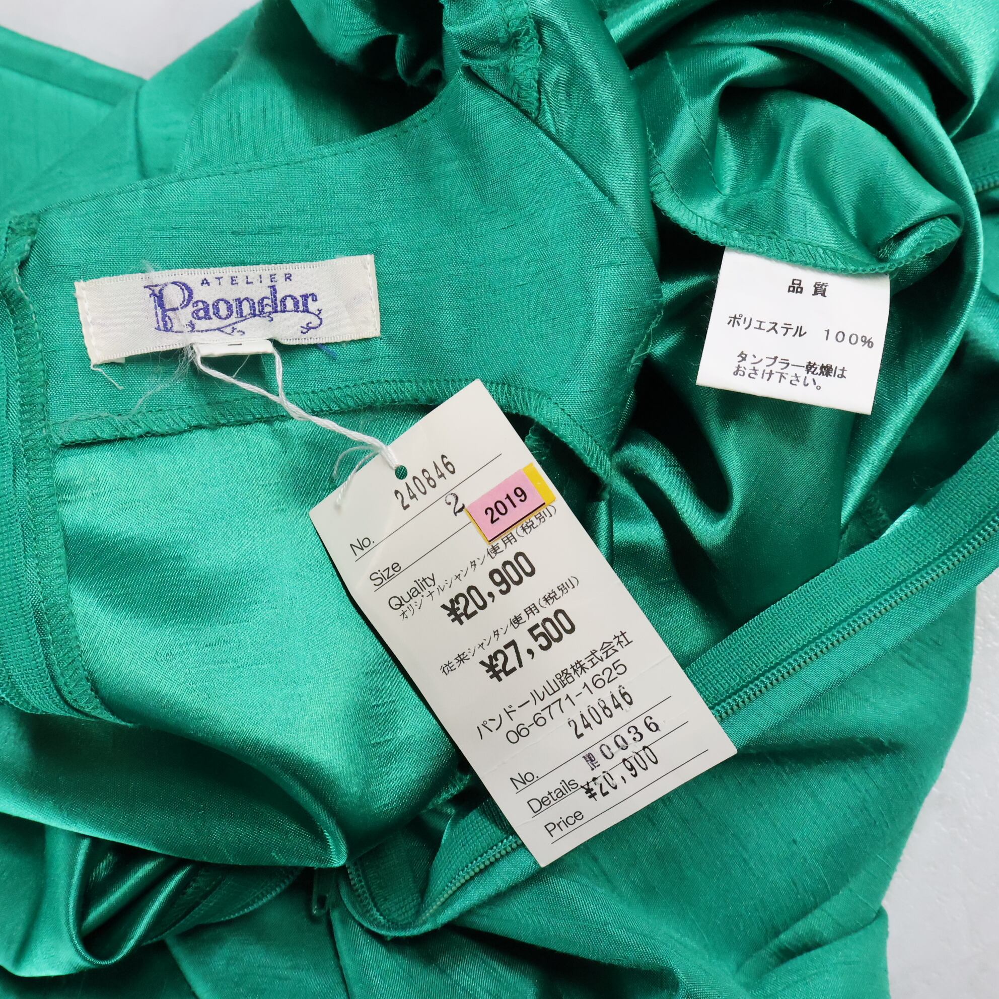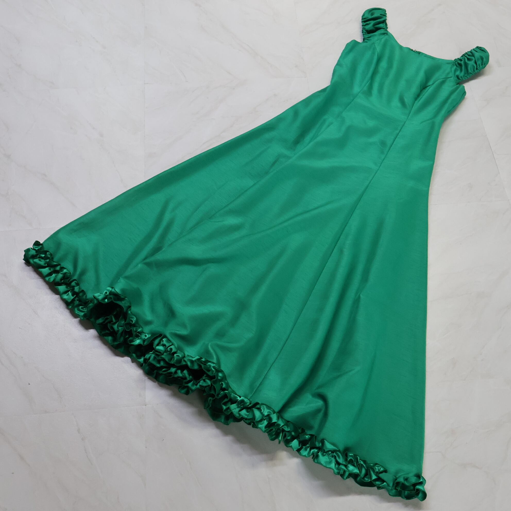 #フラダンス #ワンピースドレス #Paondor #日本製 #グリーン #光沢生地 #高級感 #鮮やかカラー #フリルデザイン #シンプル #可愛い #ダンス衣装 #ダンスコスチューム #ステージ衣装 #古着 #中古 #ENUTSU