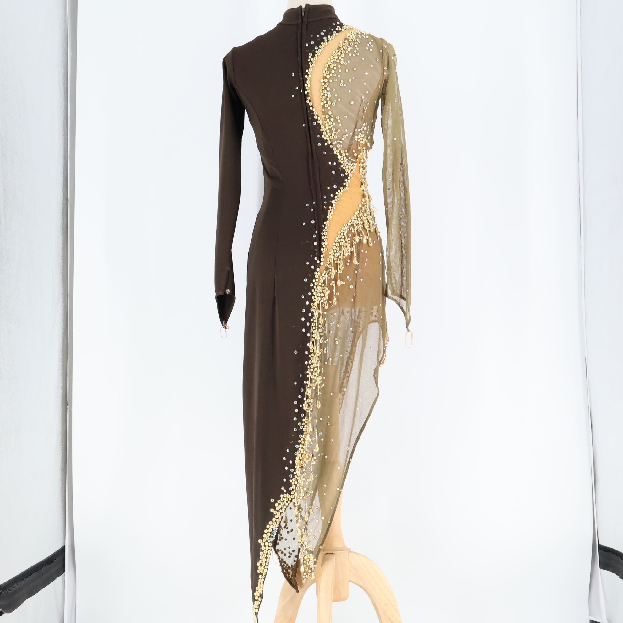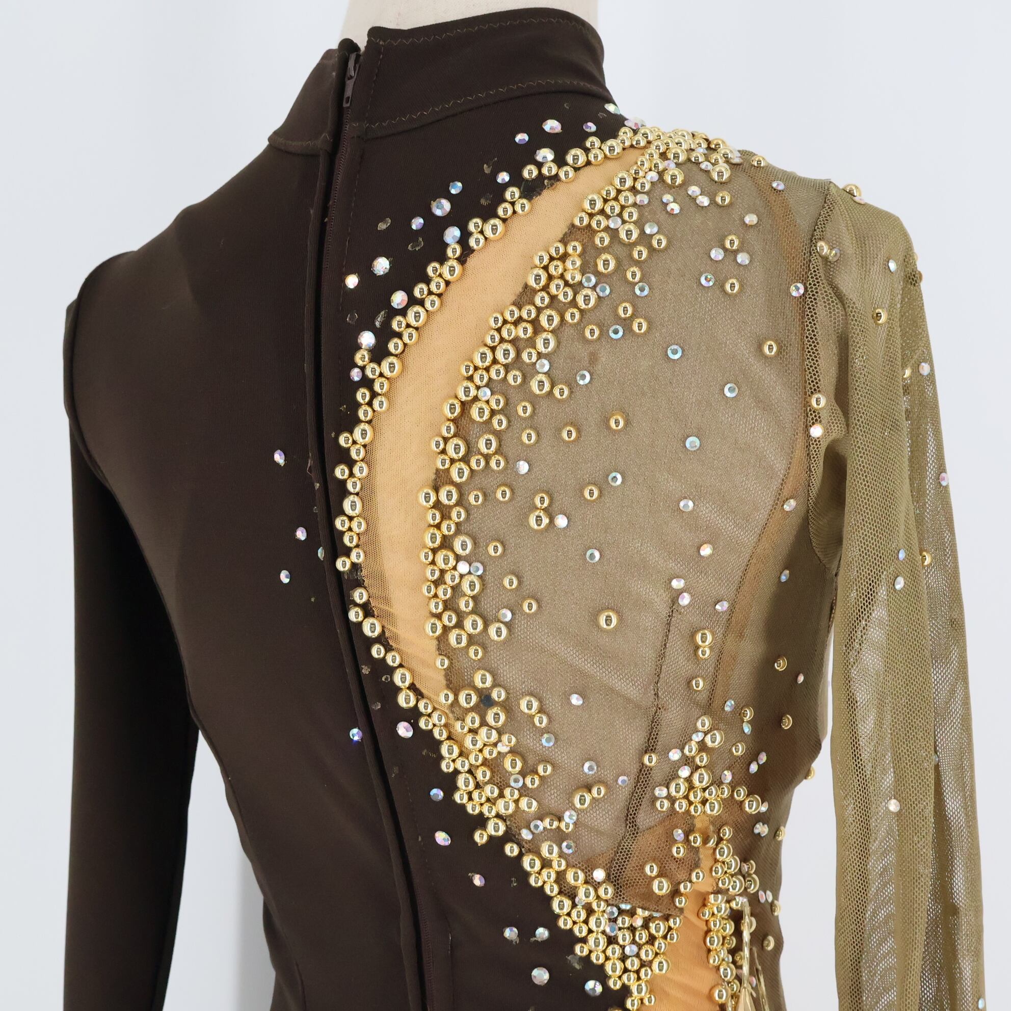 【社交ダンス衣装】ブラウン ラテン ドレス ワンピース 長袖 装飾 茶色 ゴールド 高級感 デモ 競技用 上品 お洒落 焦げ茶色