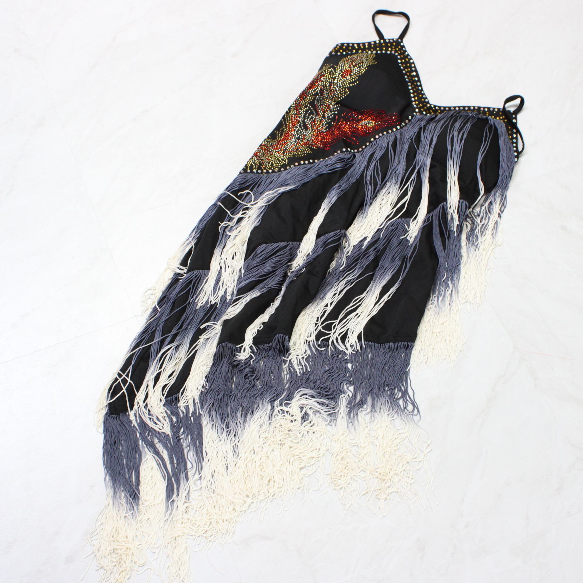 【美品 社交ダンス衣装】ワンピース ドレス ラテン フリンジ ラインストーン 黒 ブラック 白 ホワイト 青 くすみブルー 派手