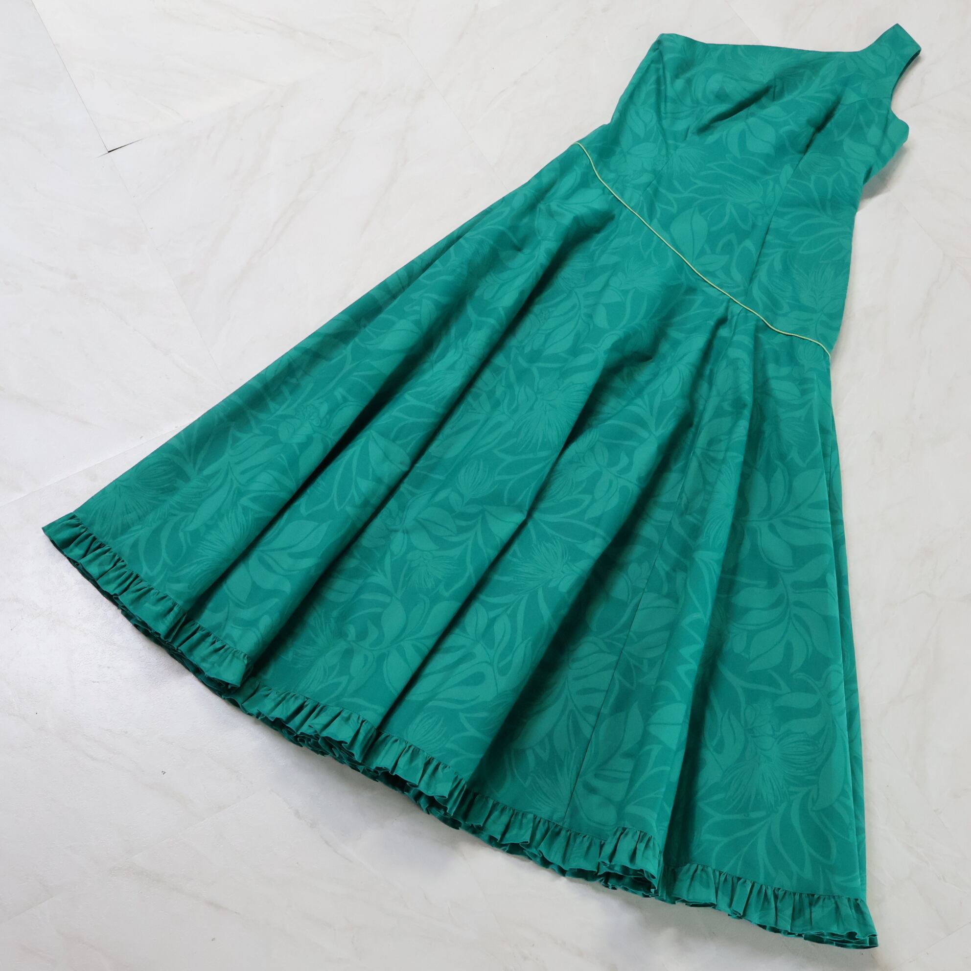 【美品 日本製 フラダンス衣装】グリーン Paondor パンドール ワンピース ドレス レフア柄 フリル 花柄 ワンショルダー 緑 花