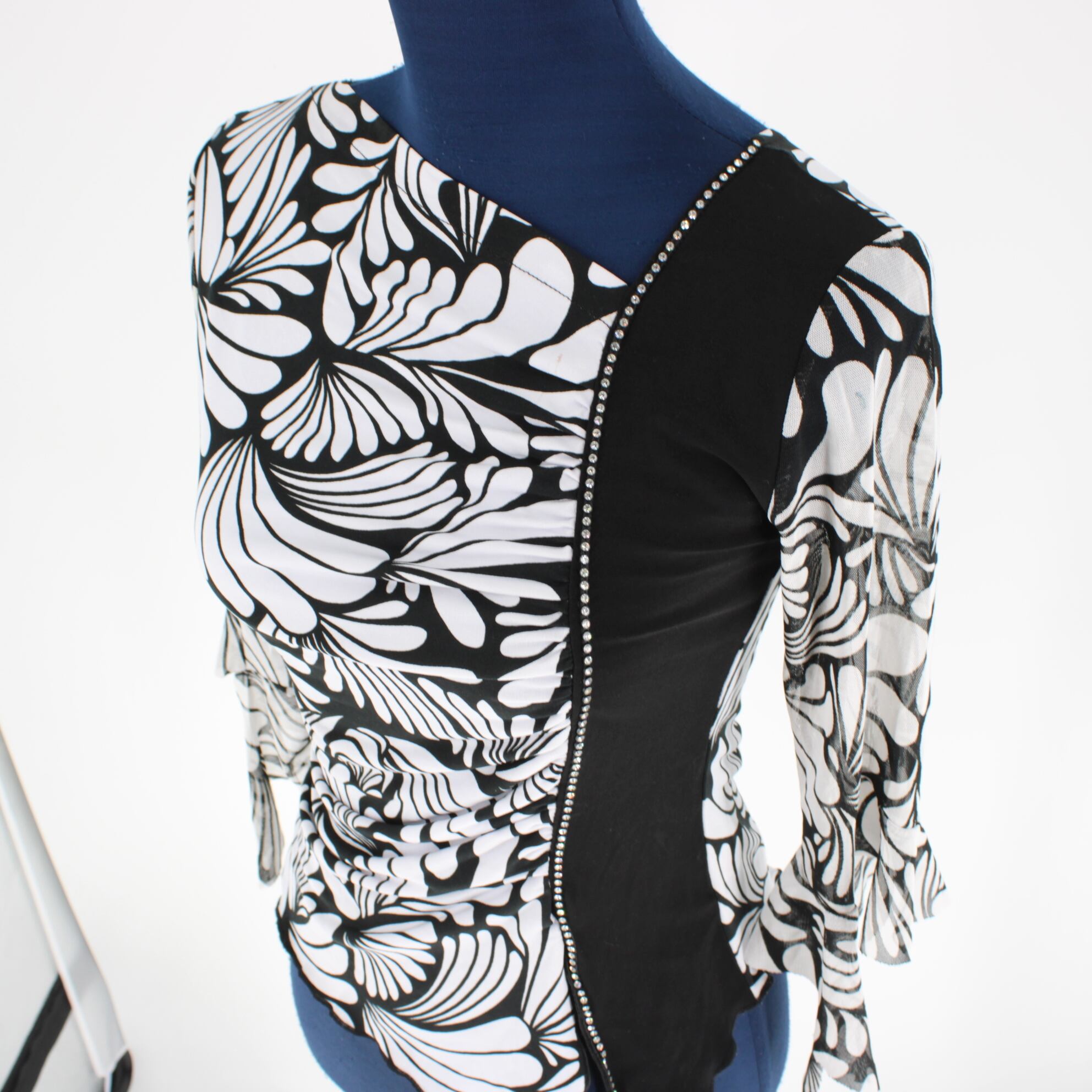 #社交ダンス #ダンストップス #ブラック #ホワイト #ラインストーン #エレガント #モノトーン #ステージ映え #ダンスファッション #競技ダンス #パーティースタイル #ダンスウェア #華やか #シンプルデザイン #舞台衣装 #ダンス衣装 #ダンスコスチューム #ステージ衣装 #古着 #中古 #ENUTSU
