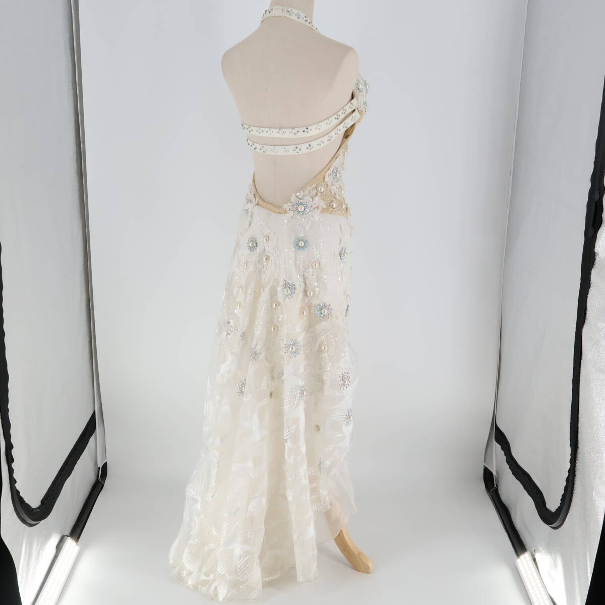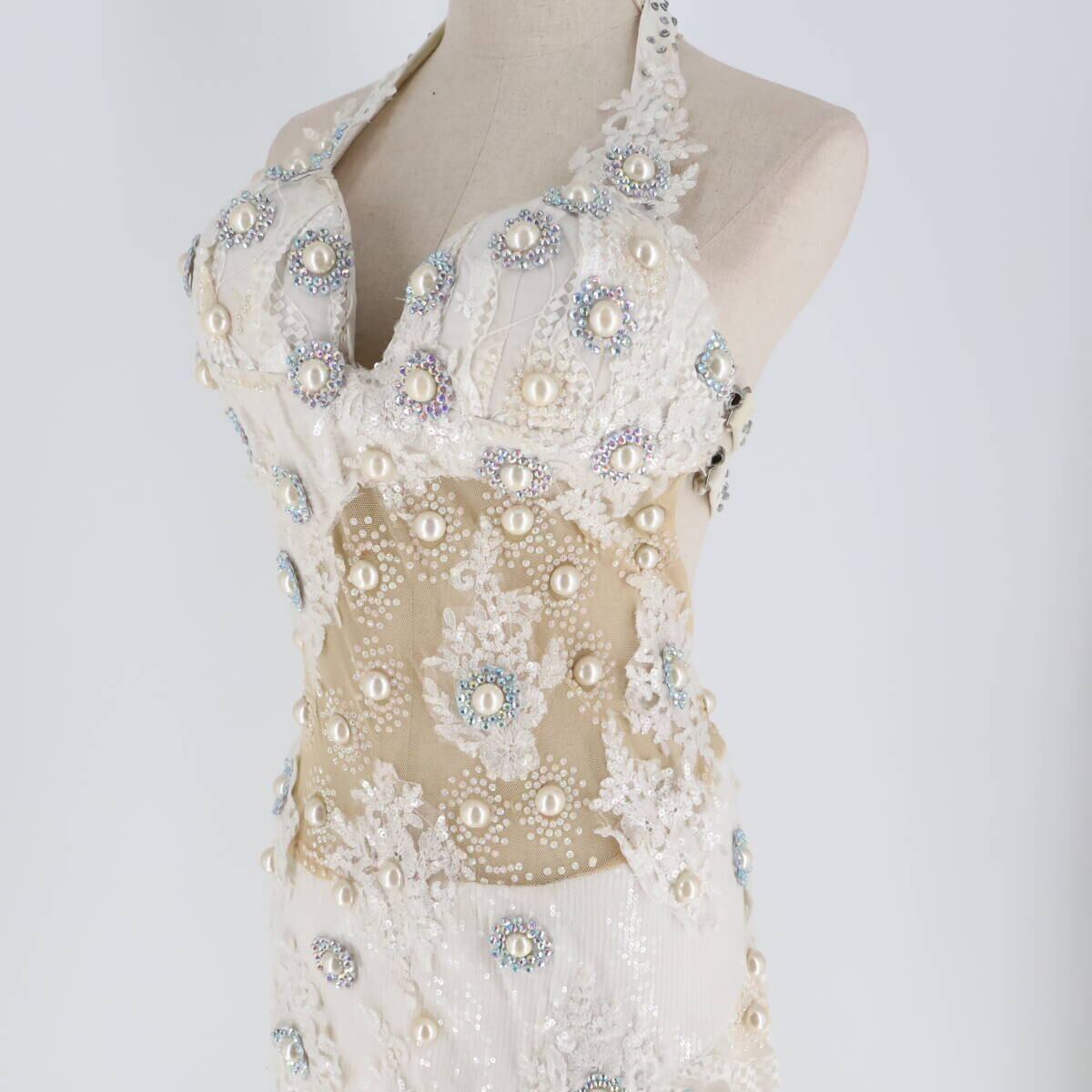 【ベリーダンス用 オリエンタル衣装】ホワイト 花柄 ラインストーン パール ビーズ レース 真っ白 ふんわり感 綺麗 一体型