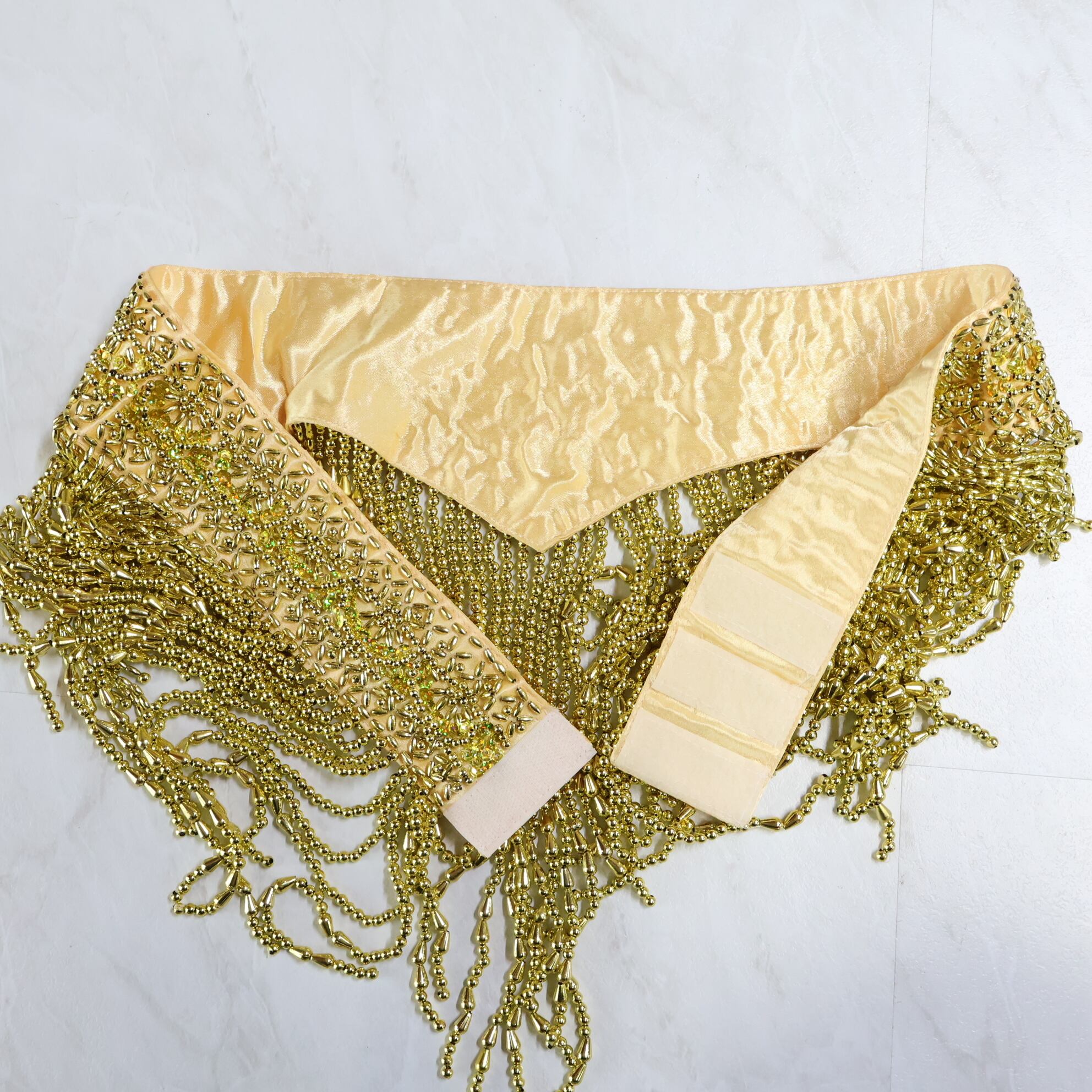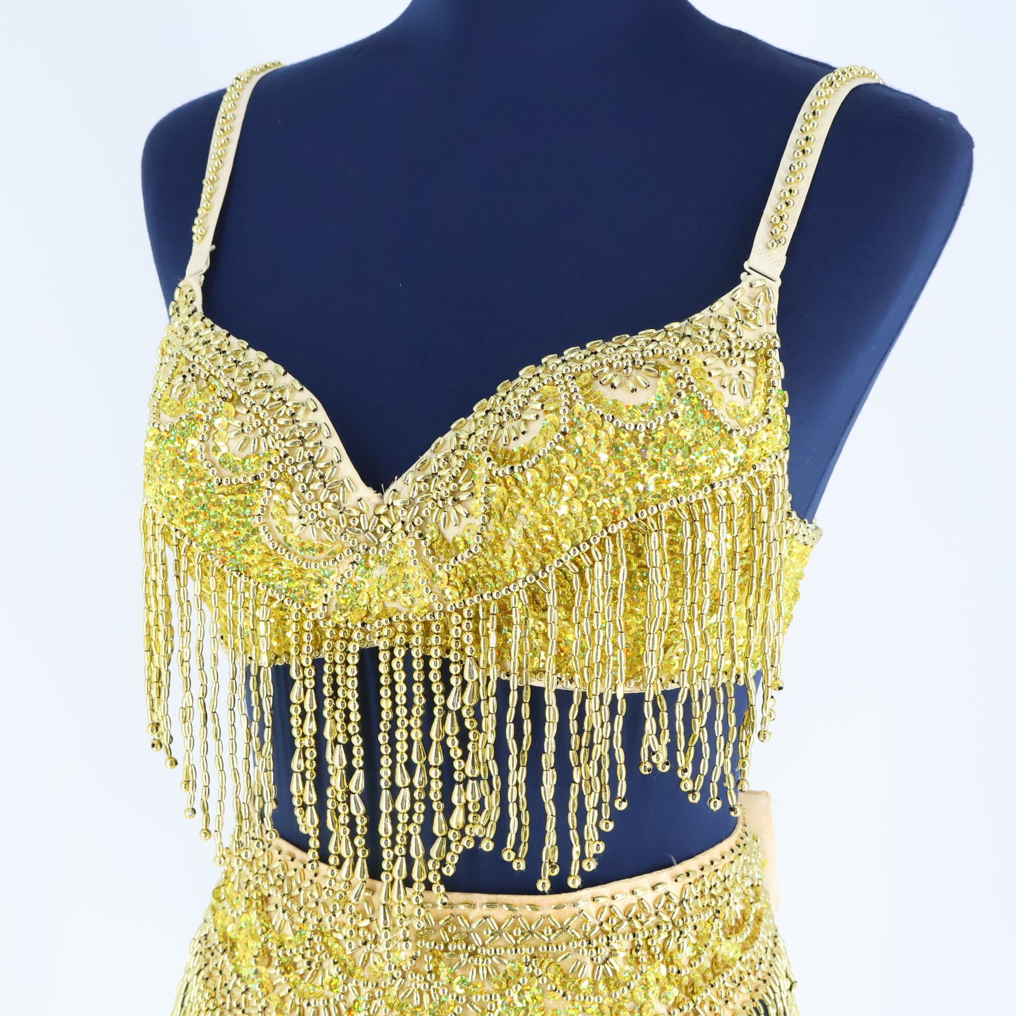 【ベリーダンス用 オリエンタル衣装】ゴールド Qiaoshi スパンコールラメ×ビーズ 2点セット 煌びやか ゴージャス 華やか 綺麗 明るい 輝き トップス ベルト セット