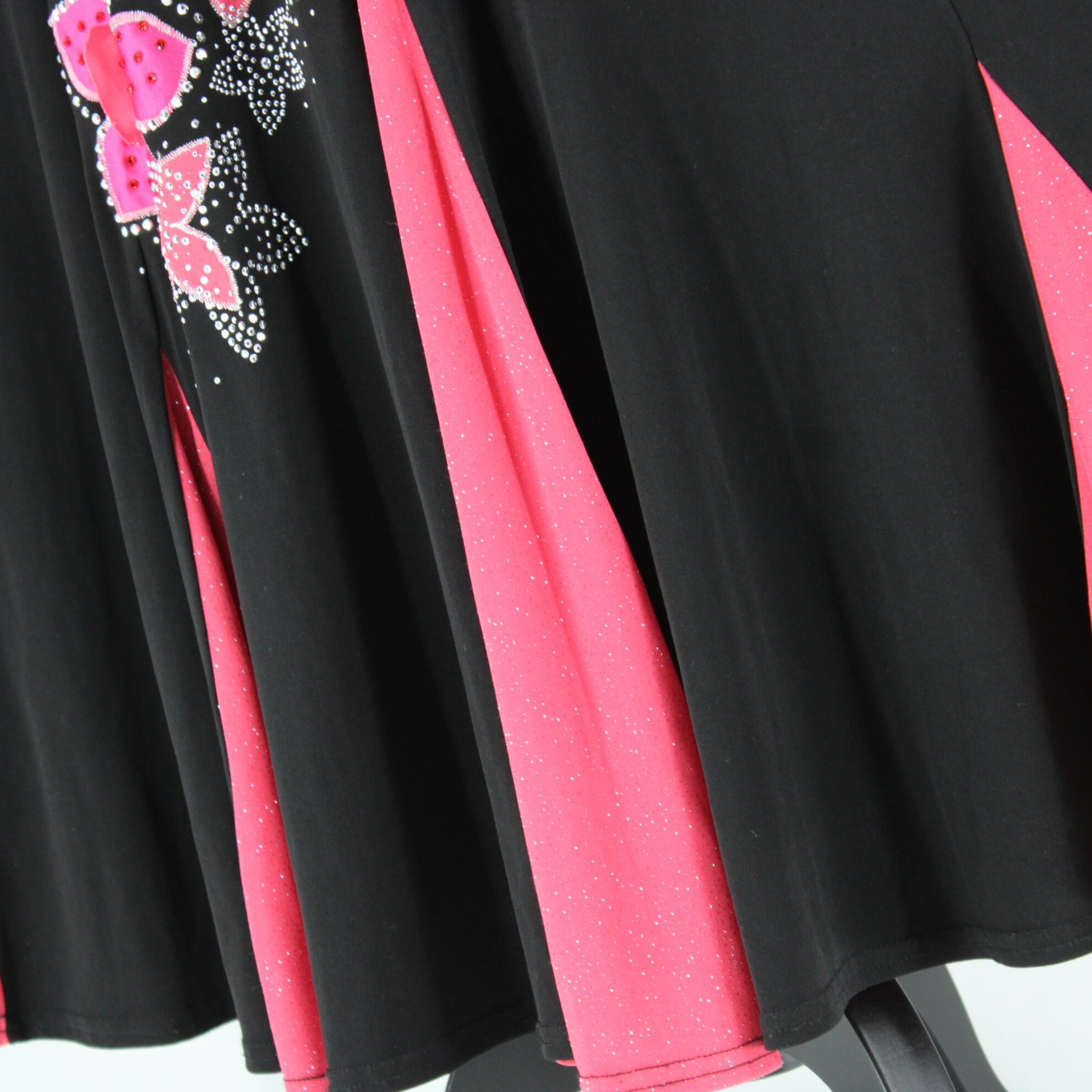 【美品 社交ダンス衣装】上下セット トップス スカート 黒 ピンク マゼンダ 花柄 ラインストーン 鮮やか かわいい 華やか 上品