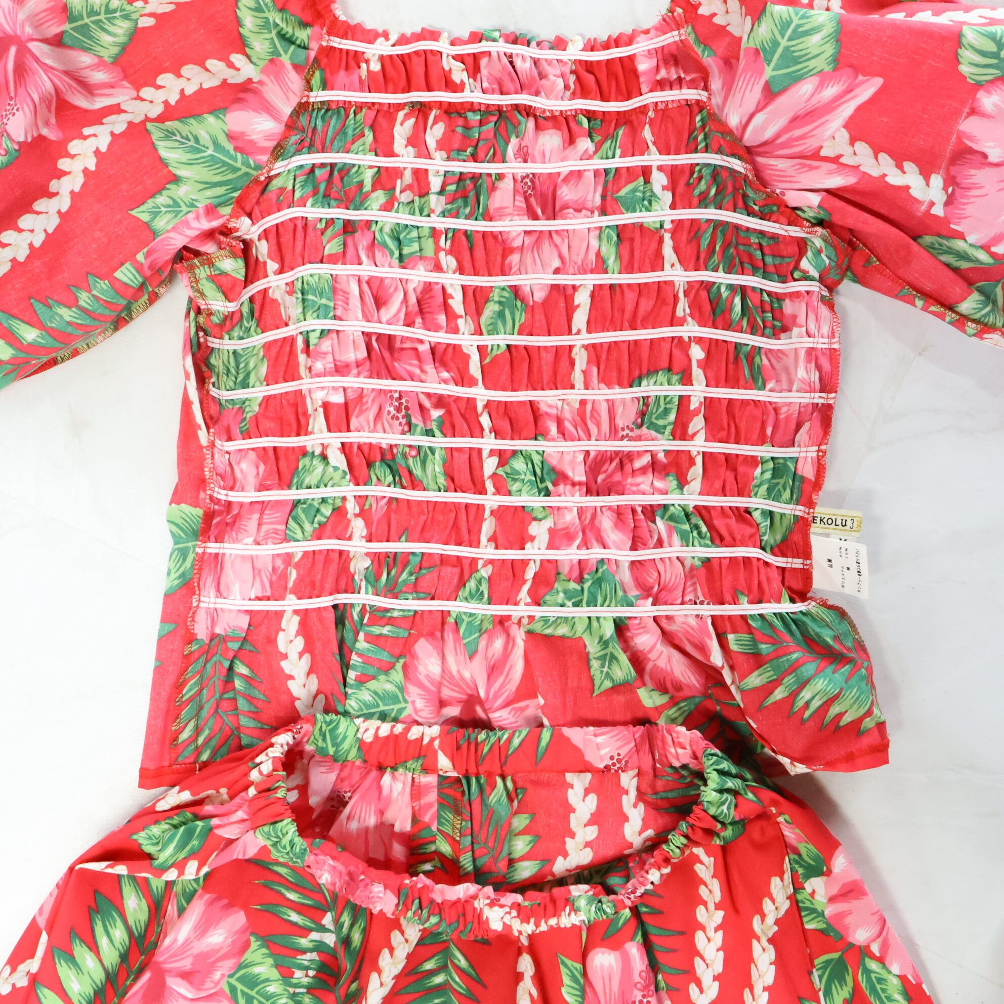 【日本製 フラダンス衣装】レッド EKOLU EHIKU エコルエヒク 上下セット ツーピース セットアップ ハイビスカス柄 赤 白 緑 花
