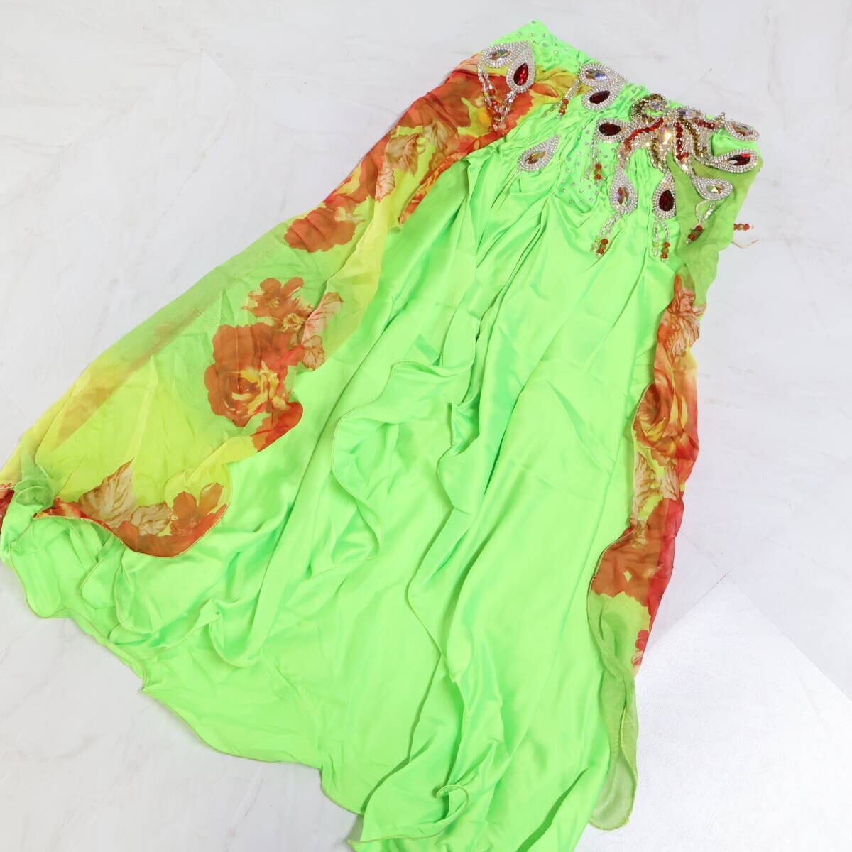【ベリーダンス用 オリエンタル衣装】黄緑色 ラインストーン 赤 シルバー ネオンカラー 豪華 明るい 爽やか レース お洒落