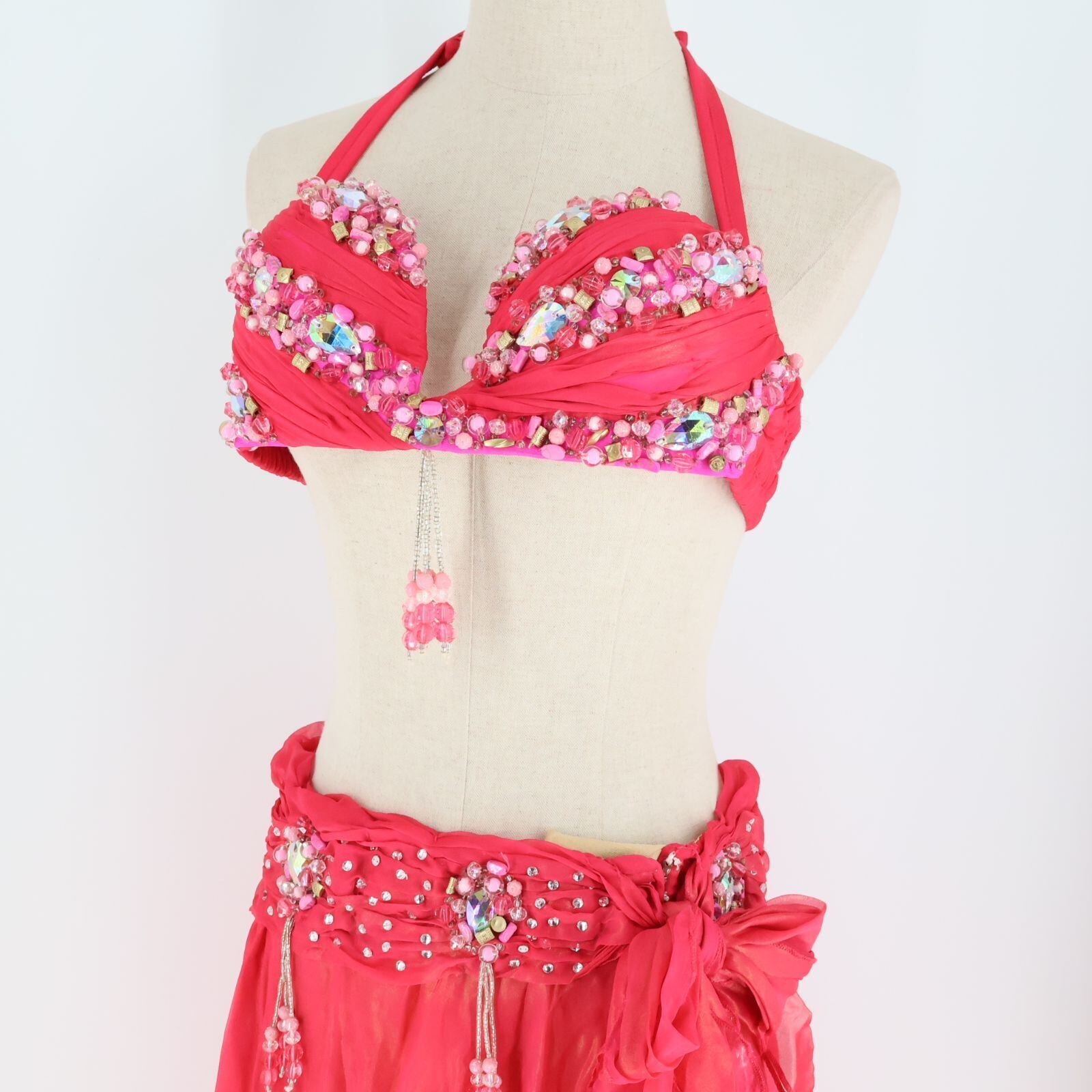 【ベリーダンス用 オリエンタル衣装】ショッキングピンク ビーズ ラメ レース シルバー 可愛い 女性らしい 鮮やか リボン
