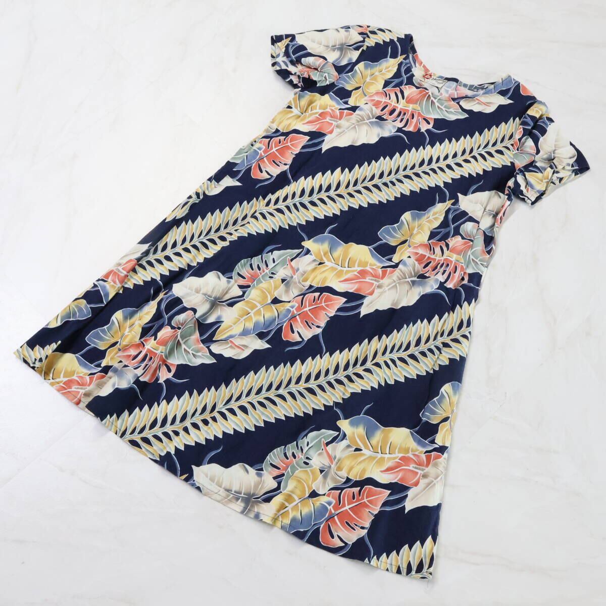【ハワイ製 フラダンス衣装】ネイビー ワンピース ドレス モンステラ柄 紺 黄 白 赤 半袖 イエロー ホワイト レッド アロハ