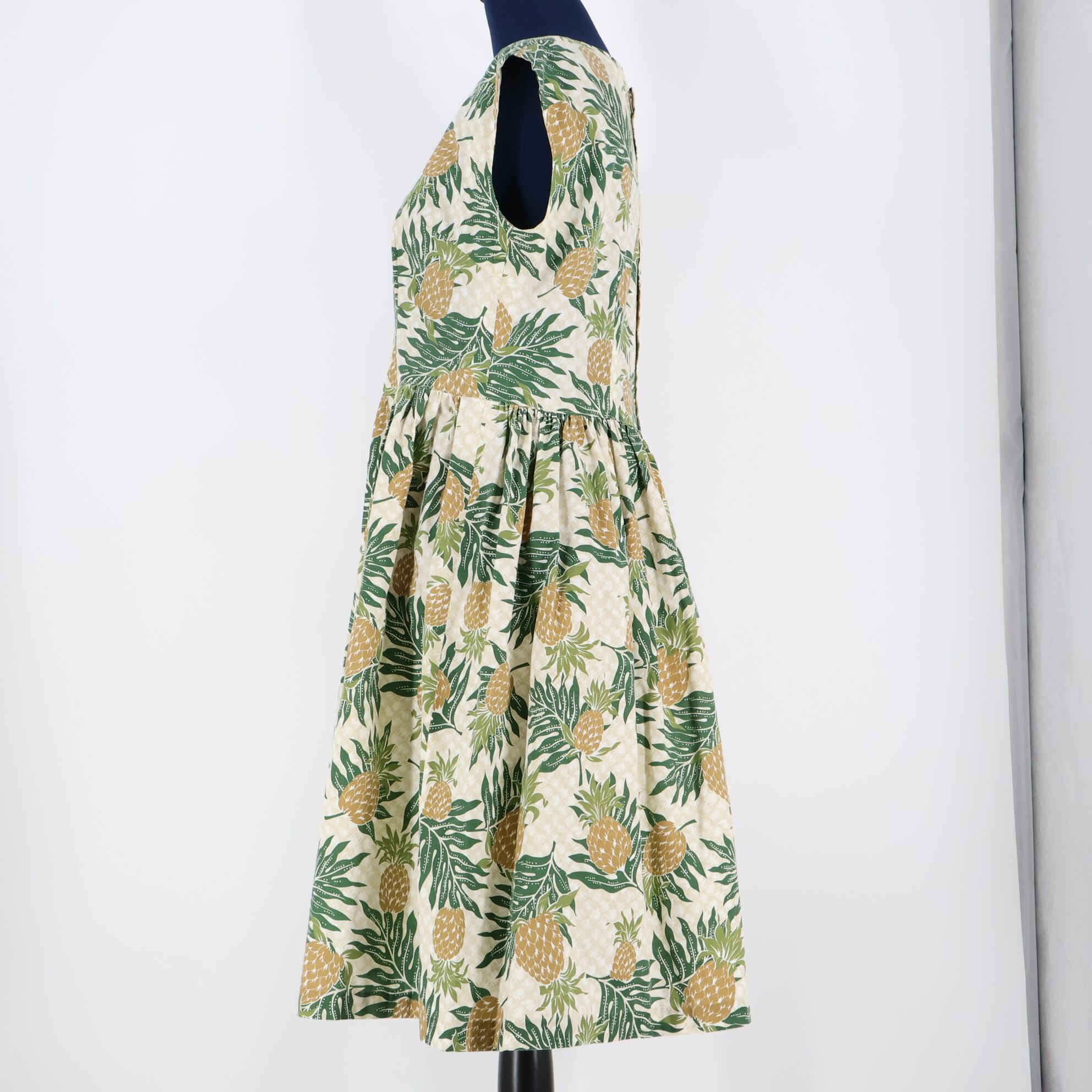 【フラダンス衣装】ベージュ ワンピース ドレス パンの木柄 グリーン クリーム色 緑 ノースリーブ ハワイアン アロハ かわいい