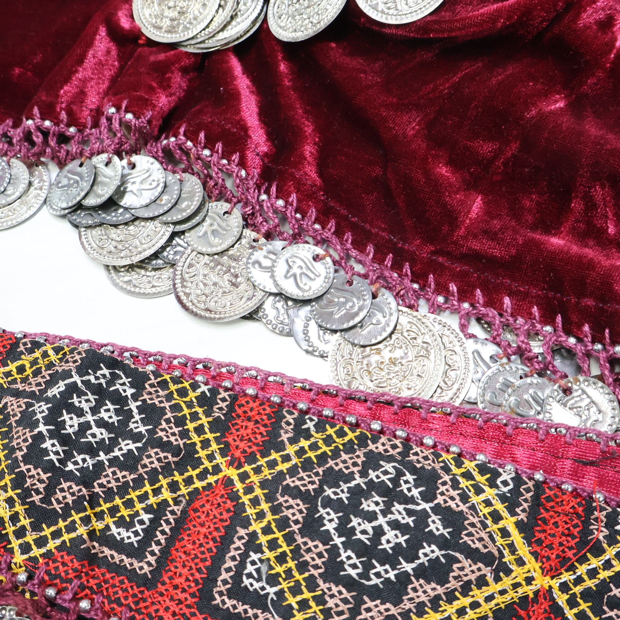 【ベリーダンス用 オリエンタル衣装】ワインレッド ベロア生地 シルバーコイン 赤 柄 異国情緒 2点セット 大人っぽい 綺麗
