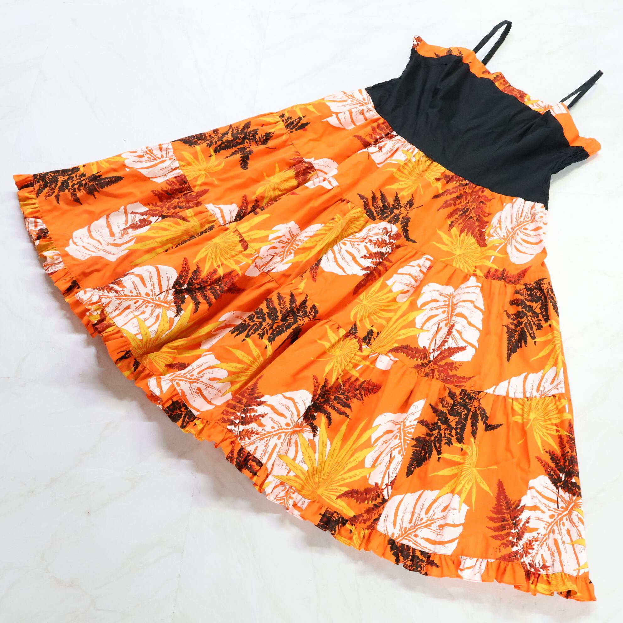 #フラダンス #ワンピースドレス #モンステラ柄 #オレンジ #ブラック #キャミソール #フリル #エレガントスタイル #フラガール #リゾートコーデ #アロハファッション #南国スタイル #華やか #ダンス衣装 #ダンスコスチューム #ステージ衣装 #古着 #中古 #ENUTSU