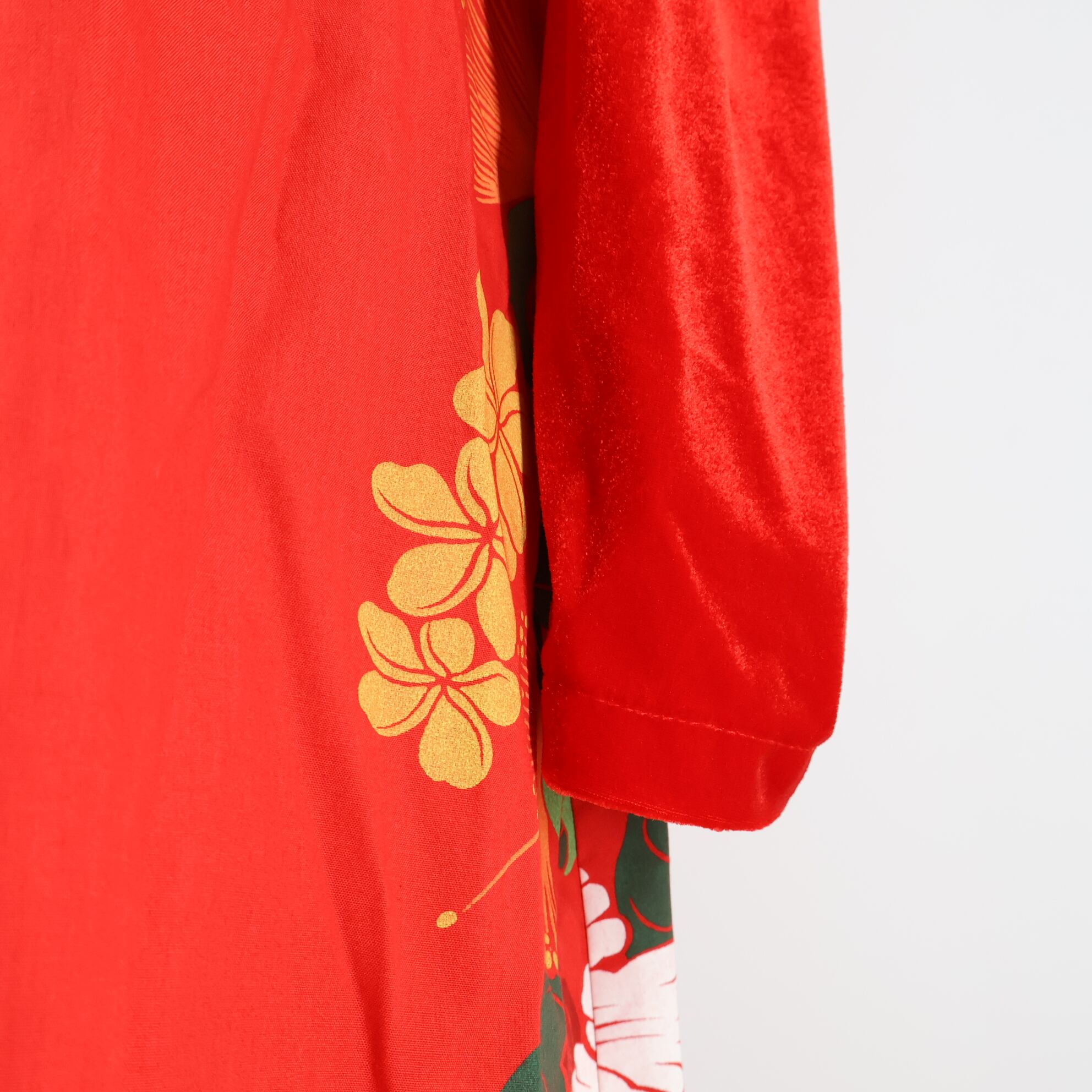 【フラダンス衣装】レッド ワンピース ドレス ハイビスカス柄 ベロア 赤 白 ホワイト 緑 花柄 鮮やか 光沢 長袖 アロハ 可愛い