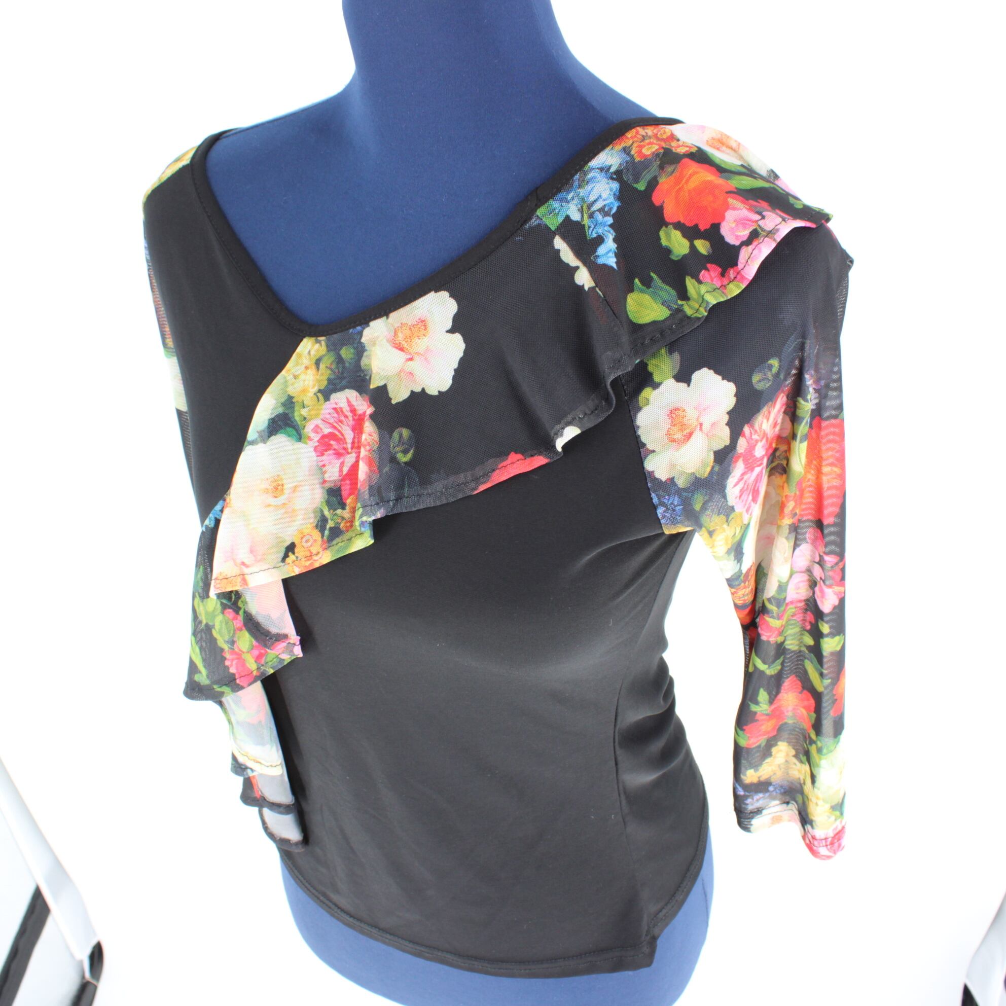 #社交ダンス #社交ダンス衣装 #ダンストップス #ブラックトップス #花柄デザイン #エレガントスタイル #シックコーデ #ステージ衣装 #ダンスファッション #上品デザイン #伸縮性あり #発表会コーデ #舞台衣装 #フラメンコ風 #シンプルトップス #ダンスウェア #古着 #中古 #ENUTSU