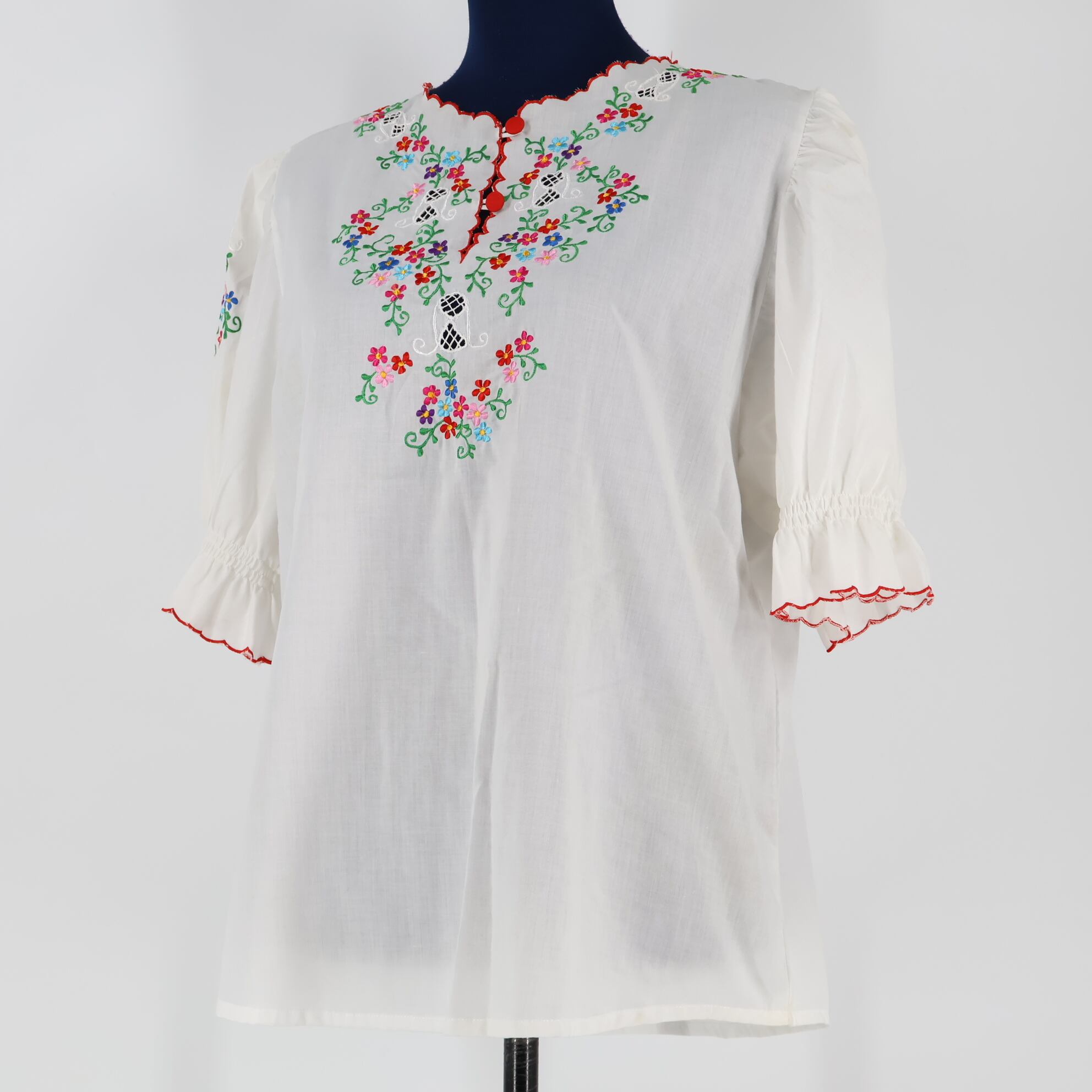 【フォークダンス衣装】ホワイト トップス ブラウス 花柄 刺繍 鮮やか 爽やか 白 レッド 赤 青 緑 ピンク ボタン スカラップ