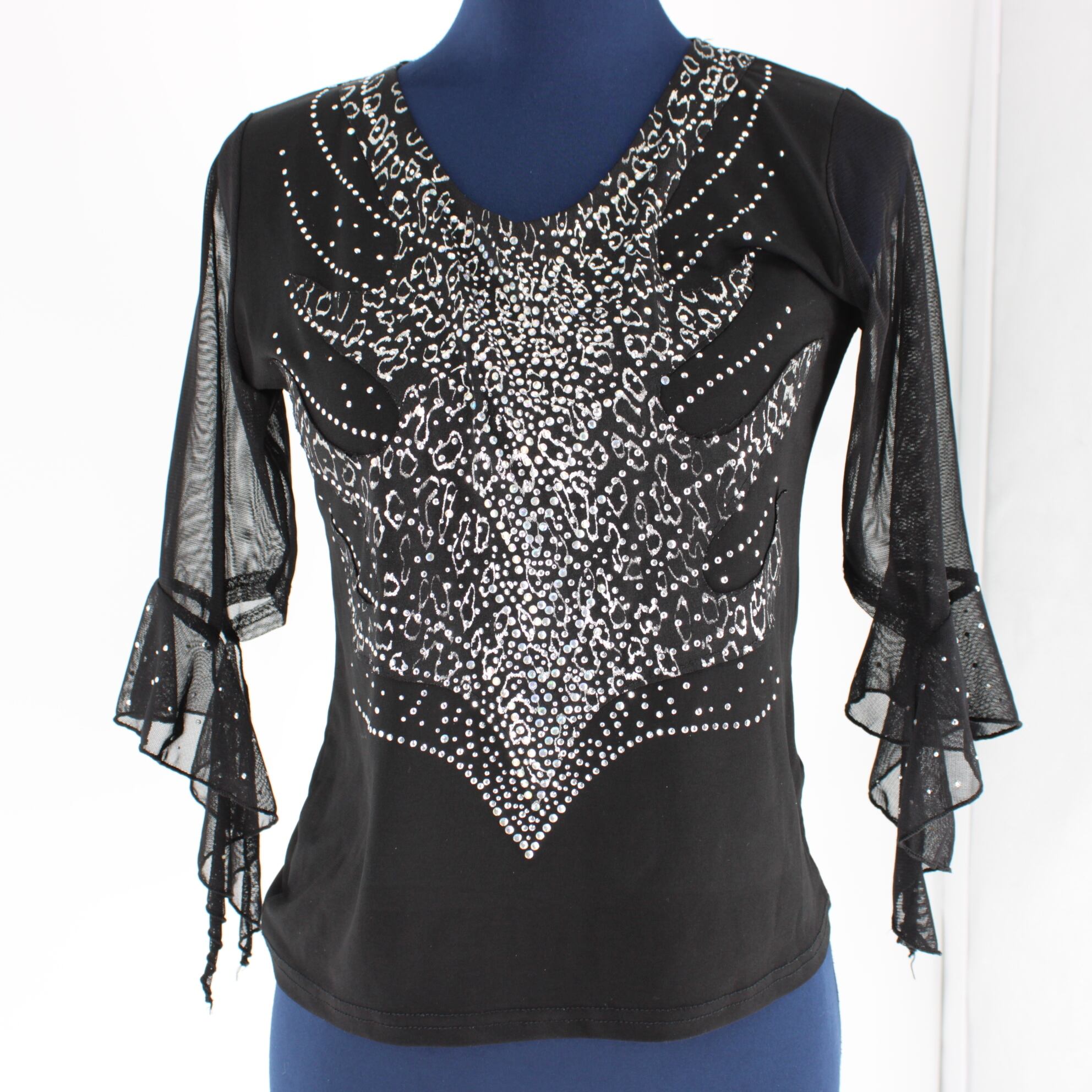 【美品 社交ダンス衣装】トップス 黒 ブラック XLサイズ ラインストーン シンプル 上品 シック クラシカル 透け感 シースルー