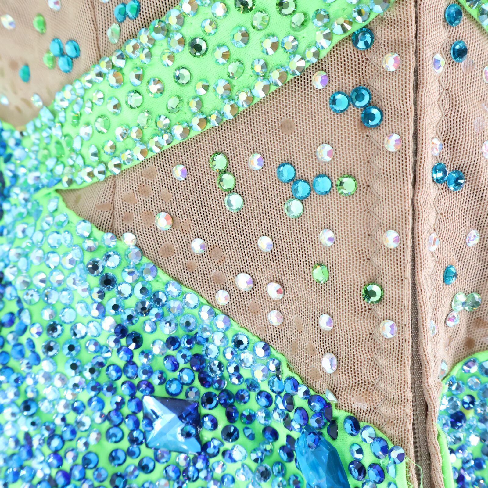 【社交ダンス衣装】グリーン ラテン ドレス ワンピース 黄緑 フリンジ ブルー 青 水色 大きめ 長袖 デモ 競技用 目立つ 蛍光