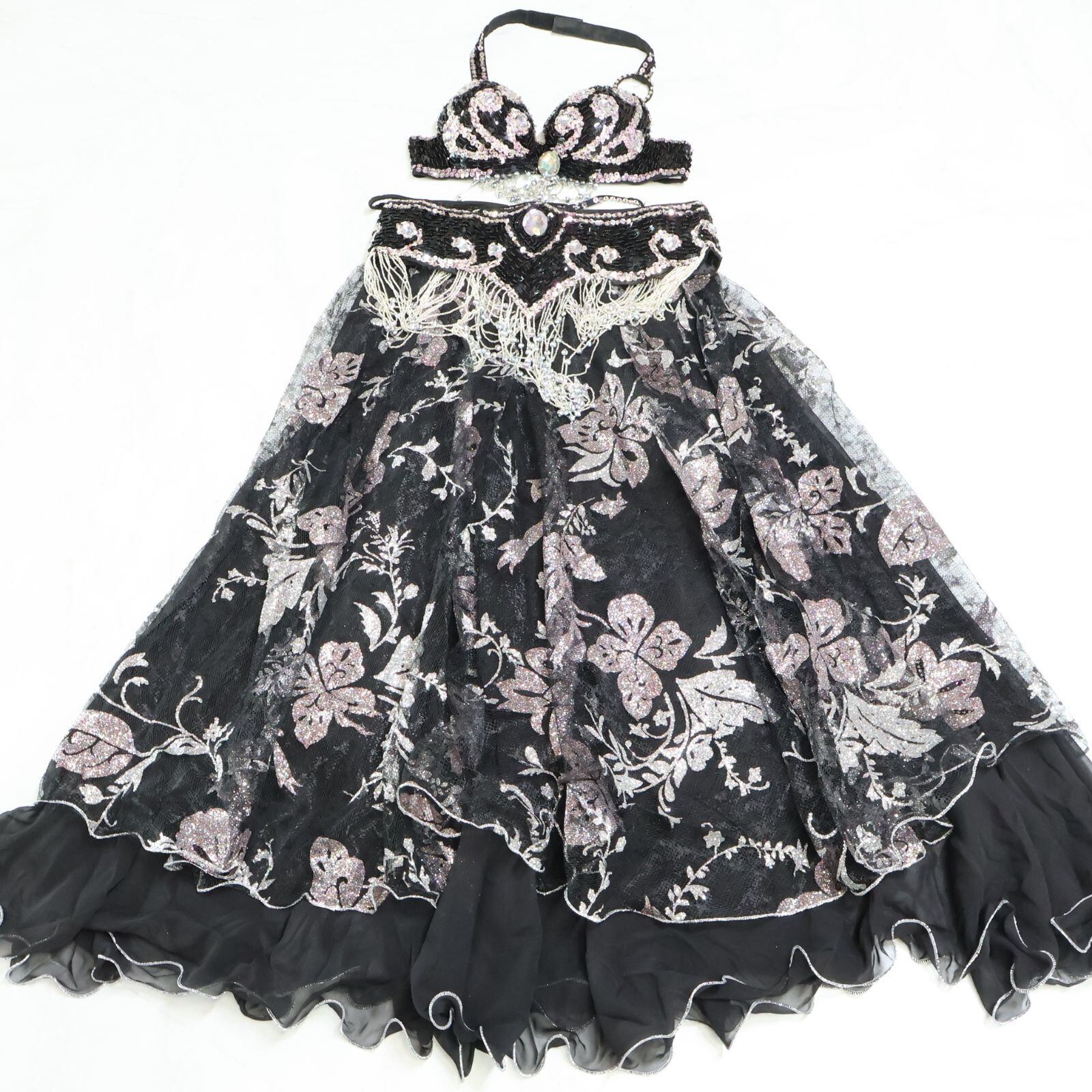 【ベリーダンス用 オリエンタル衣装】ブラック Qiaoshi ラメ×ビーズ 黒 薄ピンク シルバー 花柄 輝き 綺麗 レース ゴージャス