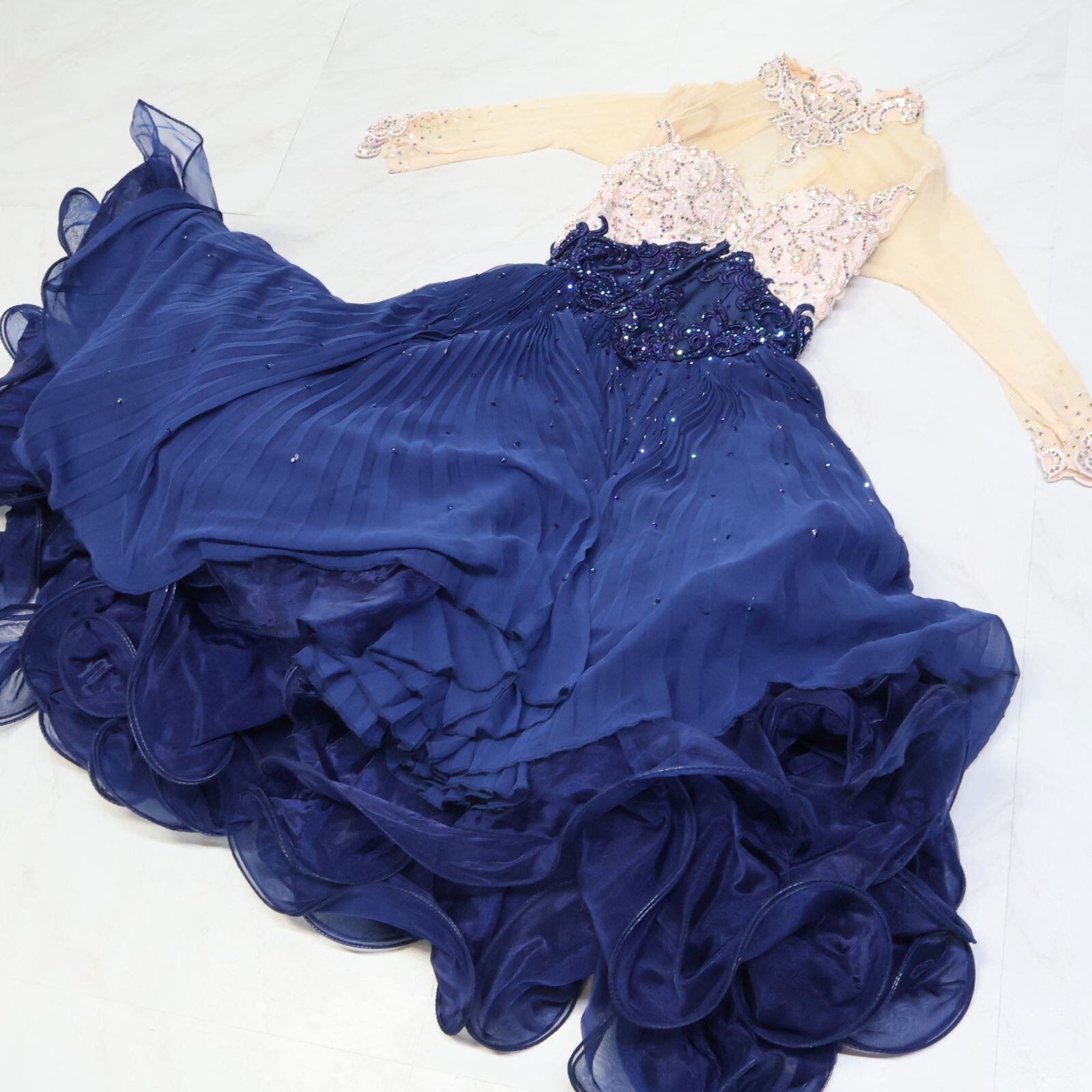 【社交ダンス衣装】ネイビー Dance fashion design room ワンピース ドレス アイボリー 紺色 高級感 上品 プリーツ デモ