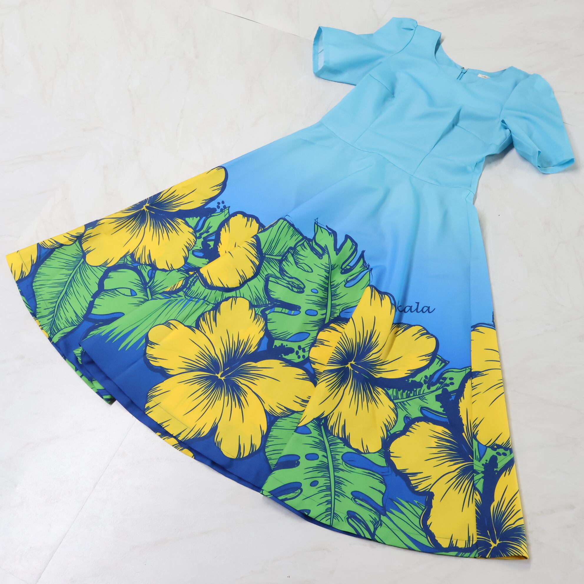 【フラダンス衣装】スカイブルー KALAS ワンピース ドレス 水色 ハイビスカス柄 イエロー グラデーション モンステラ柄 緑 青