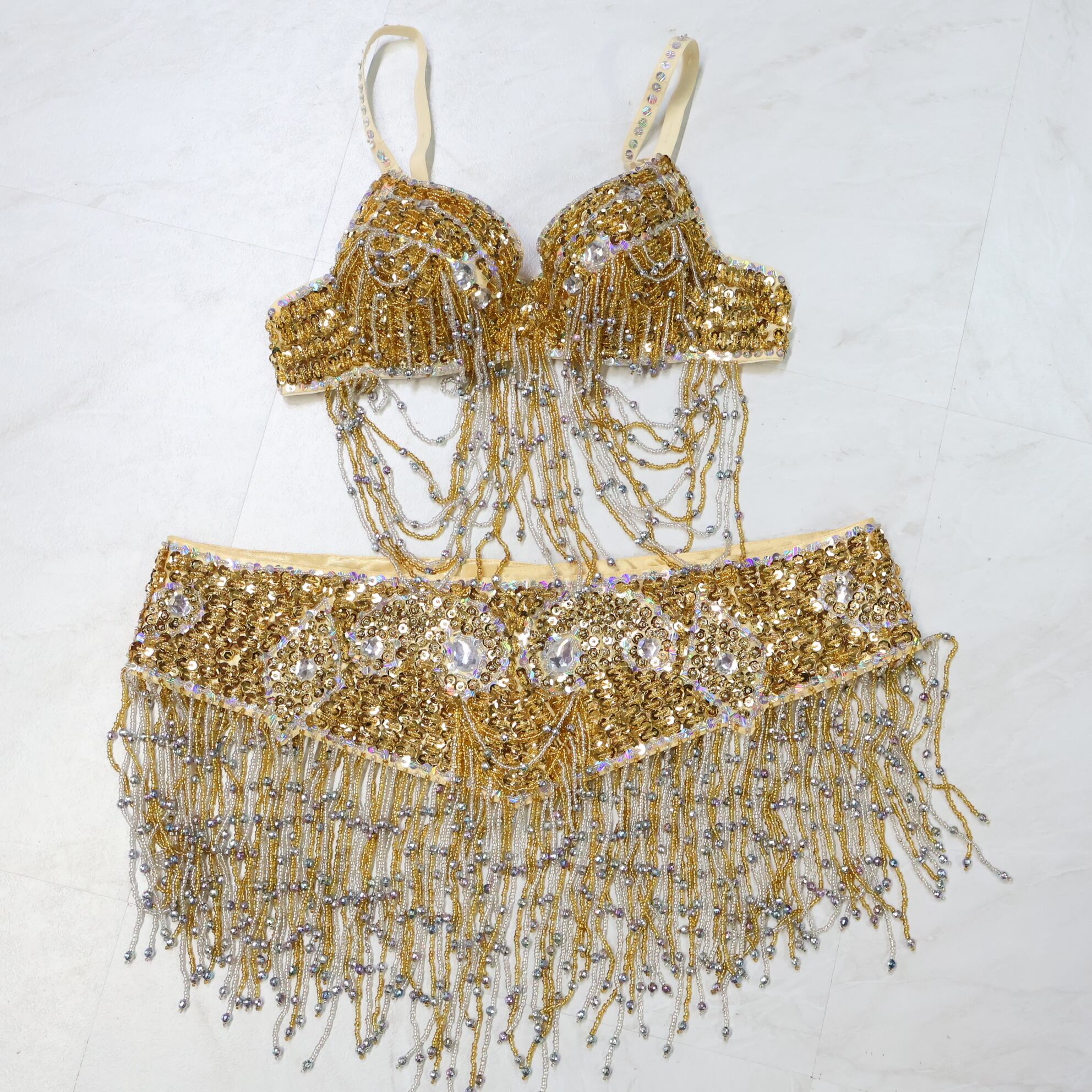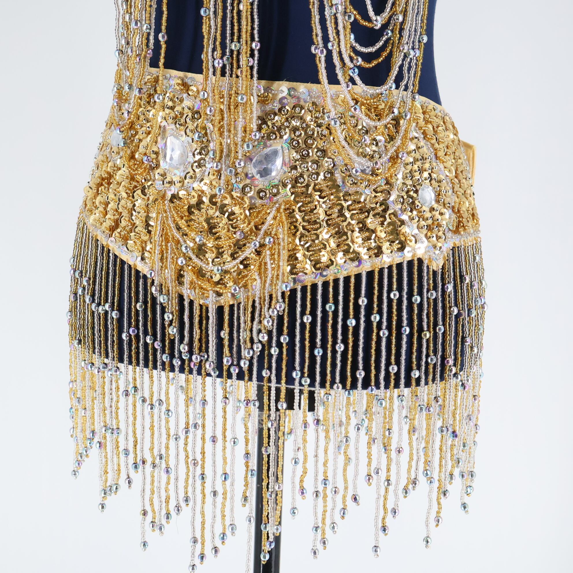 【ベリーダンス用 オリエンタル衣装】ゴールド 2点セット スパンコールラメ×ビーズ 多数付き シルバー ラメ 煌びやか 綺麗 輝き トップス ベルト セット オシャレ 豪華