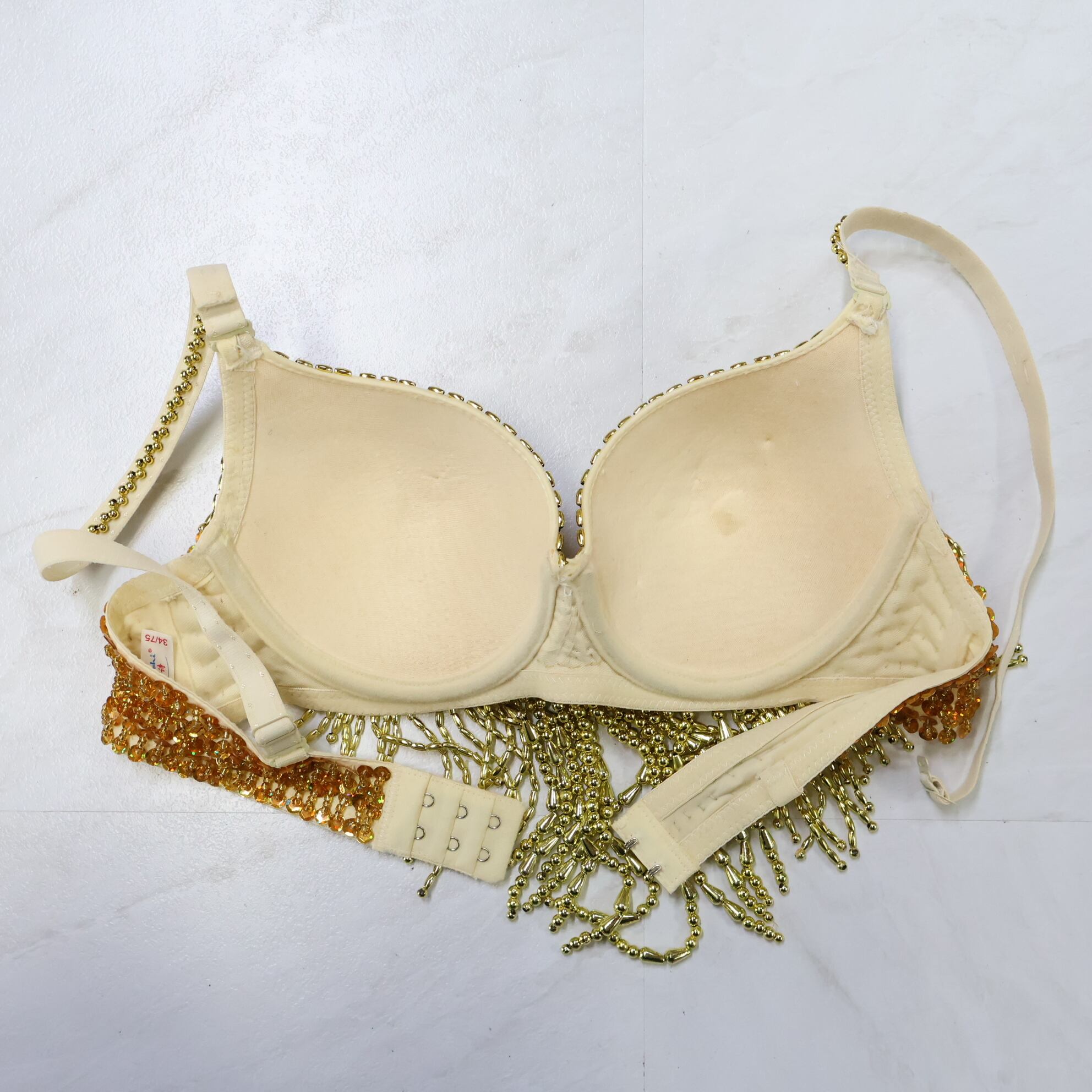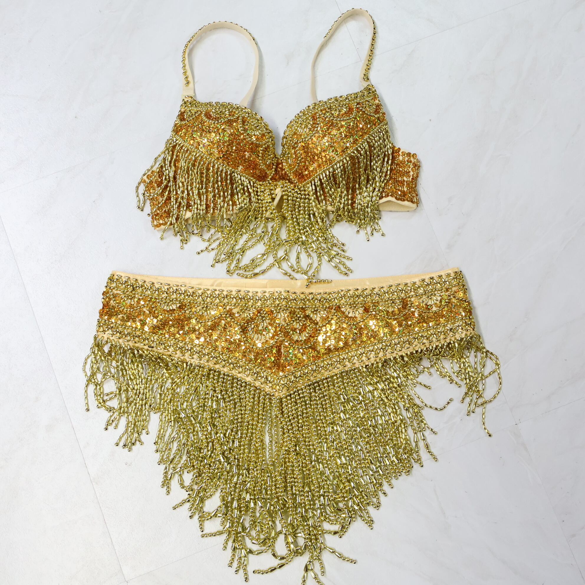 【ベリーダンス用 オリエンタル衣装】ゴールド Qiaoshi スパンコールラメ×ビーズ 多数 金 輝き ラメ ゴージャス 輝き お洒落 装飾豪華 トップス ベルト 2点セット