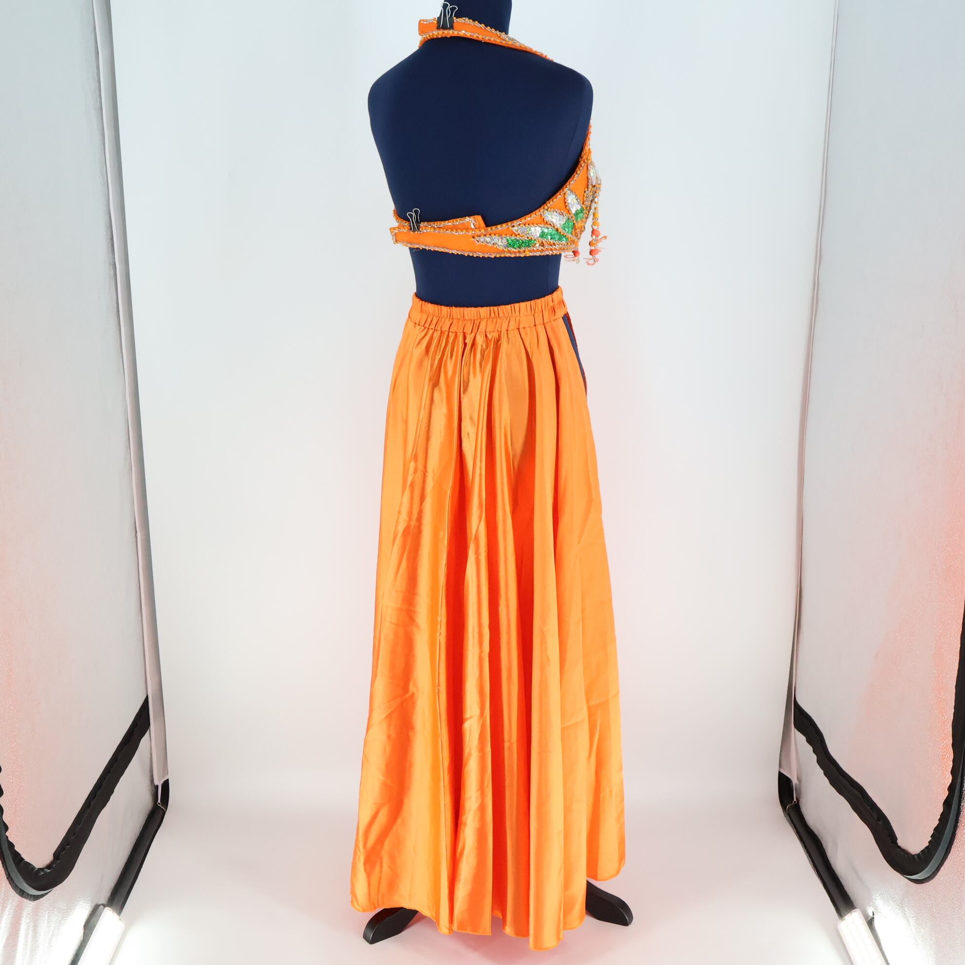 【ベリーダンス用 オリエンタル衣装】オレンジ ラメ 多数付き 緑 シルバー 花柄 ビーズ スリット 鮮やか 明るい サテン生地 華やか 目立つ トップス スカート アクセサリー 上下セット