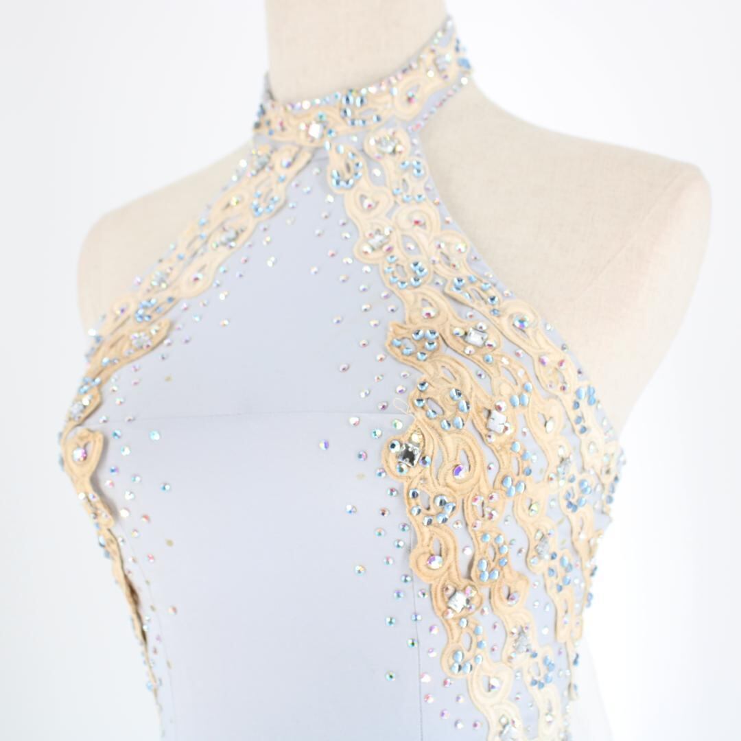 【社交ダンス衣装】グレー ワンピース ドレス フロート 白 灰色 無地 ラインストーン 上品 綺麗 パーティ 発表会 落ち感