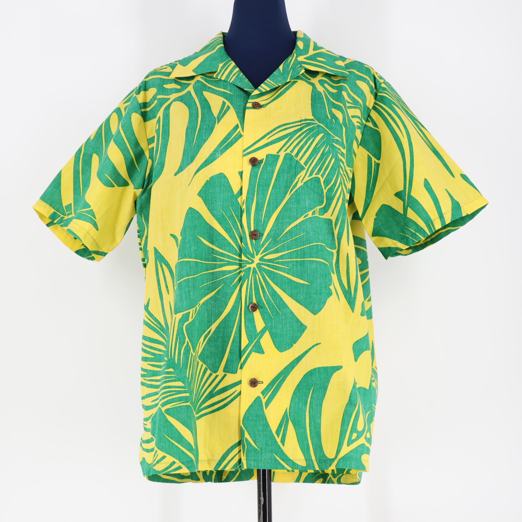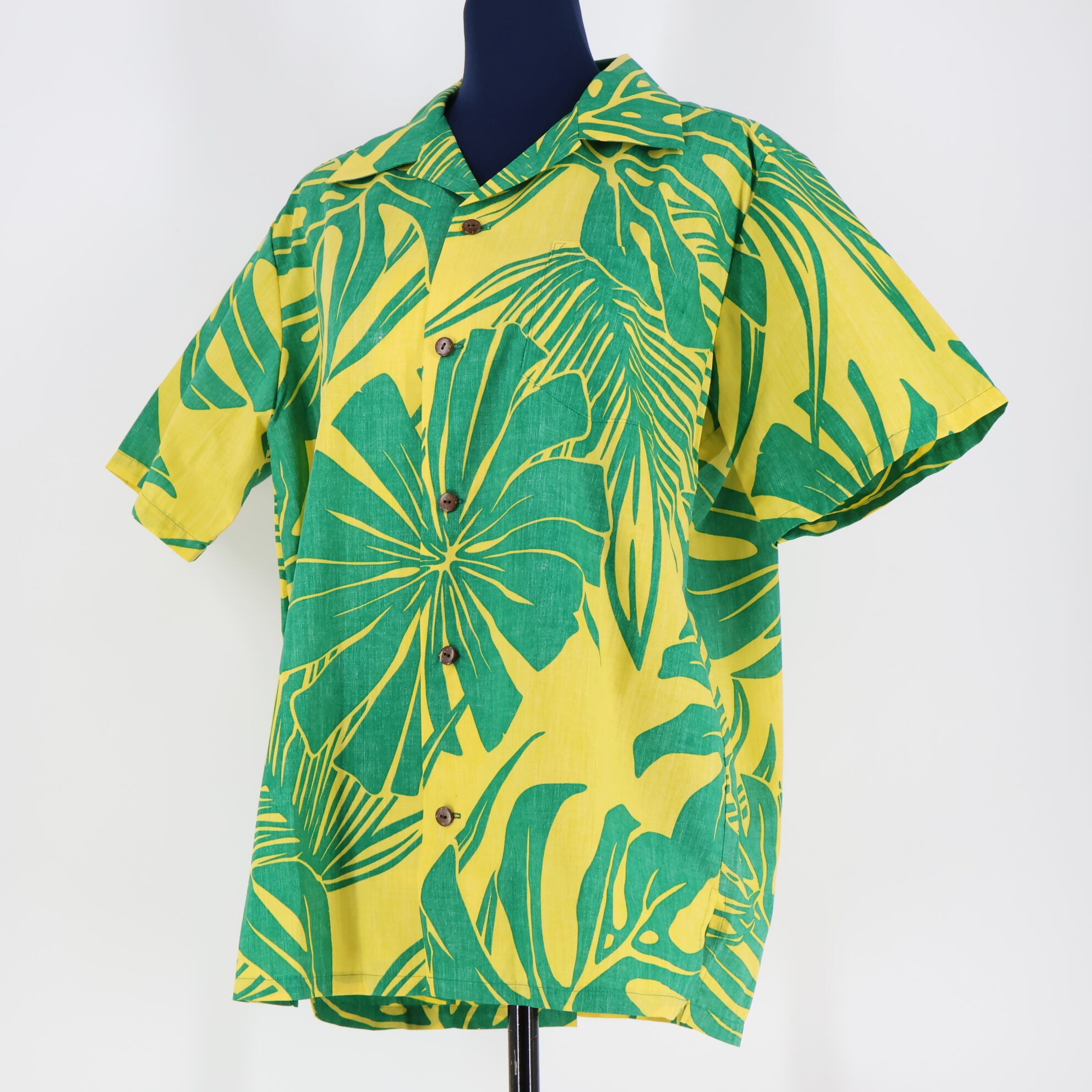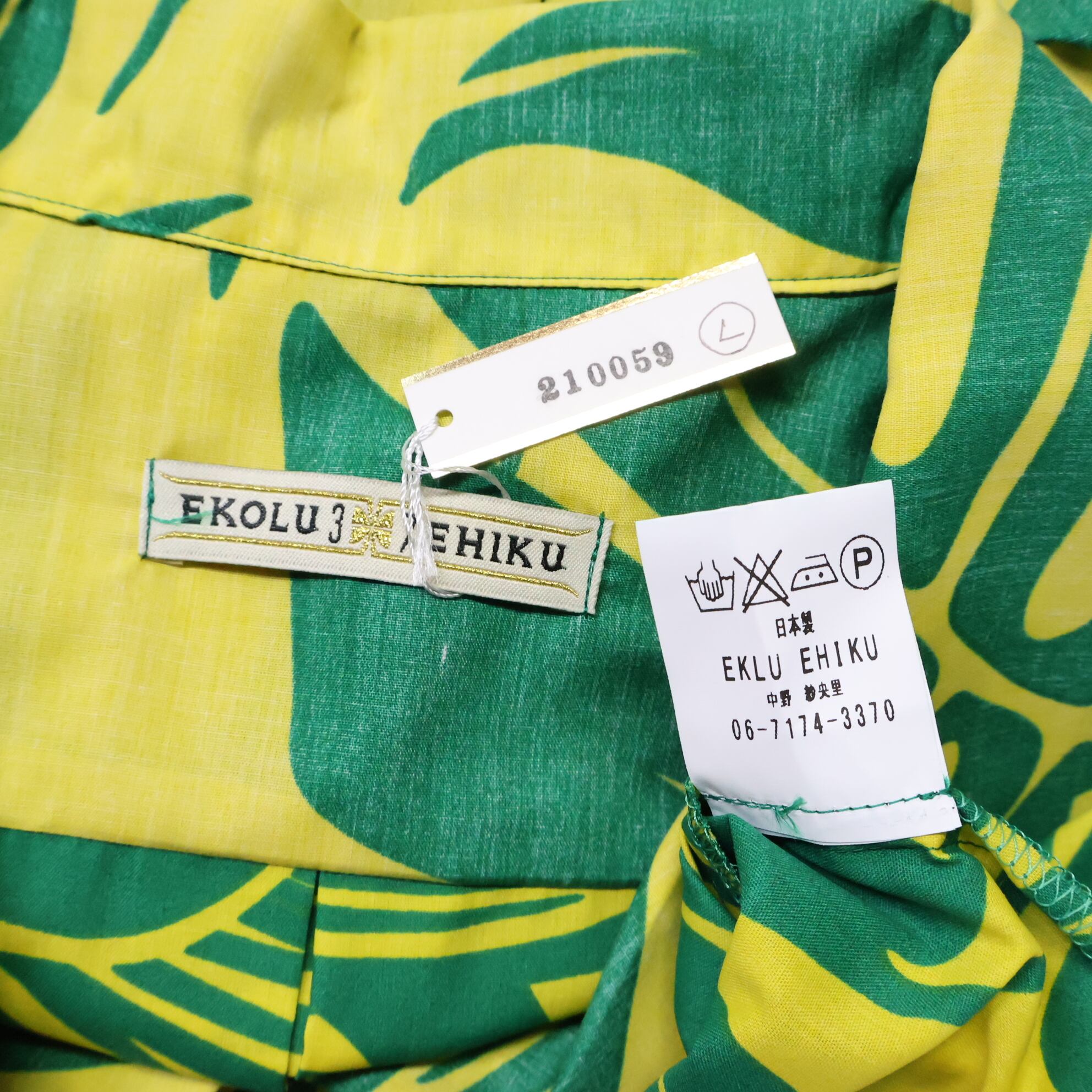 【美品 日本製 フラダンス衣装】イエロー EKOLU EHIKU エコルエヒク トップス アロハシャツ モンステラ柄 緑 半袖 鮮やか ①
