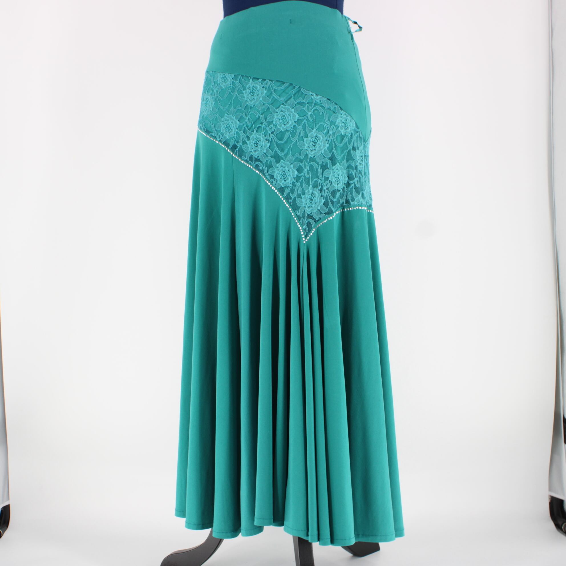 【美品 社交ダンス衣装】スカート レッスンウェア 練習着 グリーン 緑 青緑 ラインストーン 花柄 レース かわいい 上品 清楚