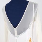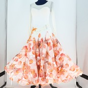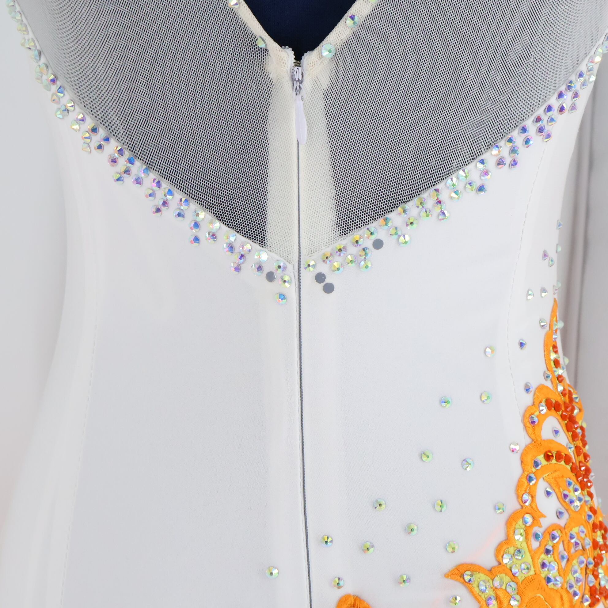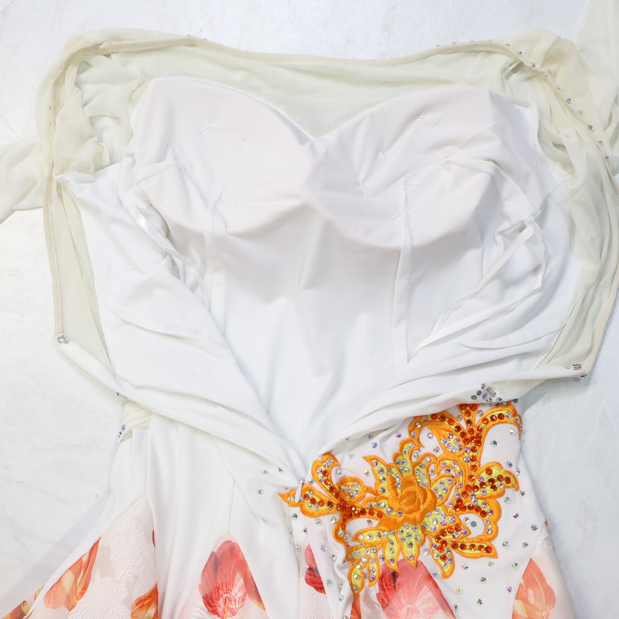 【美品 社交ダンス衣装】オレンジ ワンピース ドレス ホワイト 白 花柄 ふんわり 発表会 パーティ フリル レース 軽い 上品 ブラウンオレンジ系 落ち着いた色味 スカート3枚重ね 胸パッド有り ストレッチ素材 上半身伸縮柔らかい おしゃれなデザイン 大人可愛い 華やかさ 輝くステージ いつでも着られる 活動的