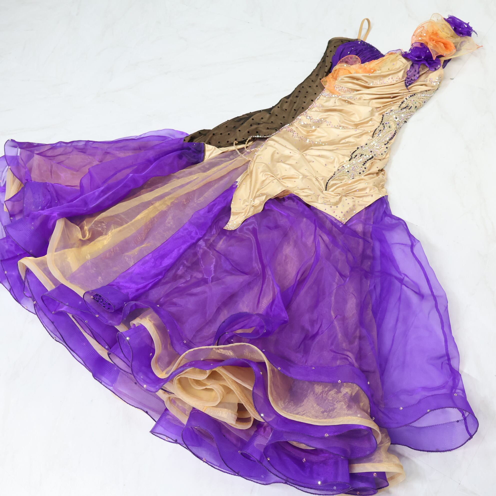 【美品 社交ダンス衣装】パープル KAORI カオリ ワンピース ドレス 紫 ベージュ ゴールド 光沢 フリル レース 競技用 デモ おしゃれ 着やすい ダンスパフォーマンス フィット感 サイドファスナー ストレッチ 胸パッド 素敵 長丈 美しい 練習用 プロフェッショナル