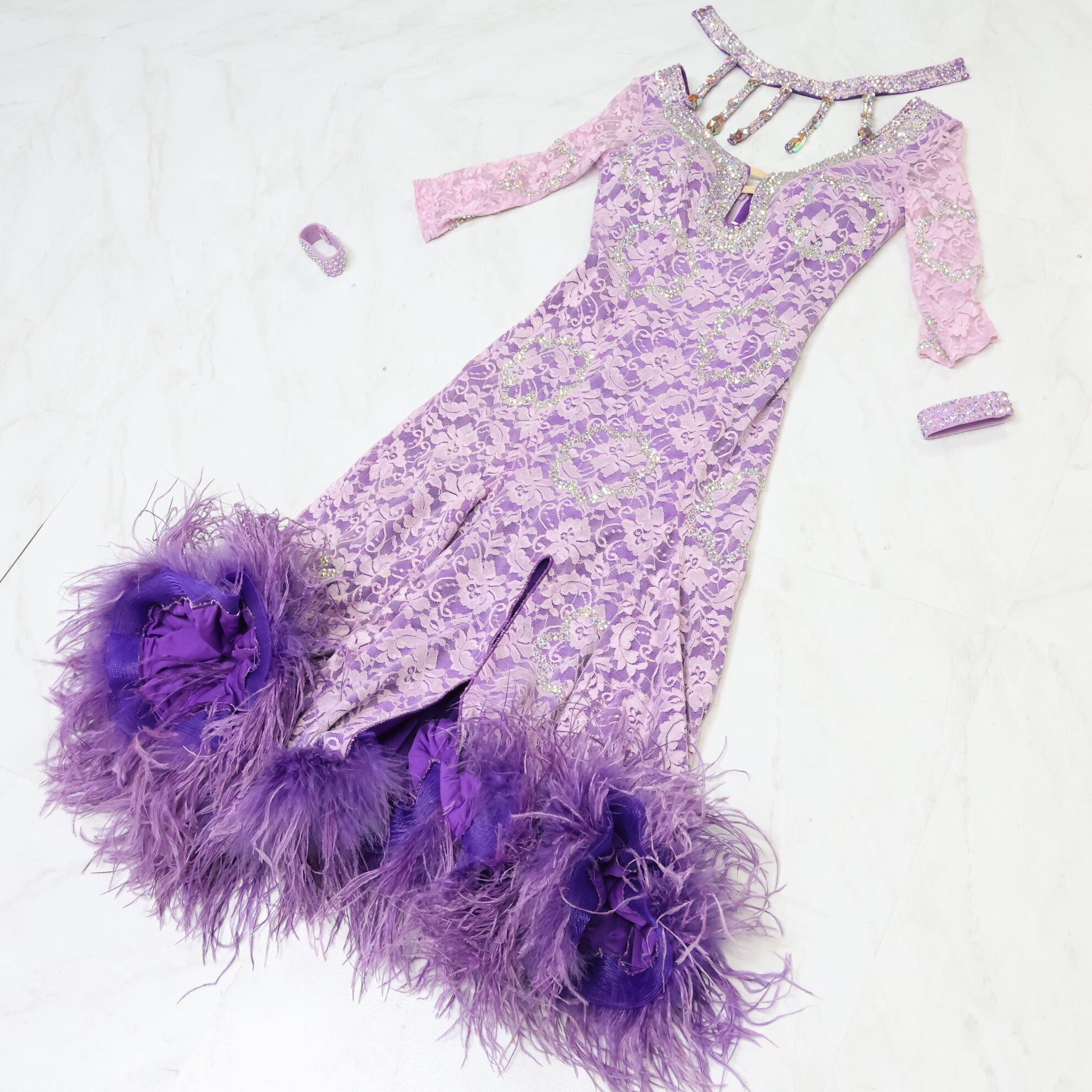 #社交ダンス #ダンス衣装 #ラテン #ドレス #ワンピース #レース #ファー #ラベンダー #上品 #高級感 #女性らしい #競技用 #デモ用 #胸パッド #伸縮性 #背面ファスナー #フレア #おしゃれ #ダンス衣装販売 #ENUTSU