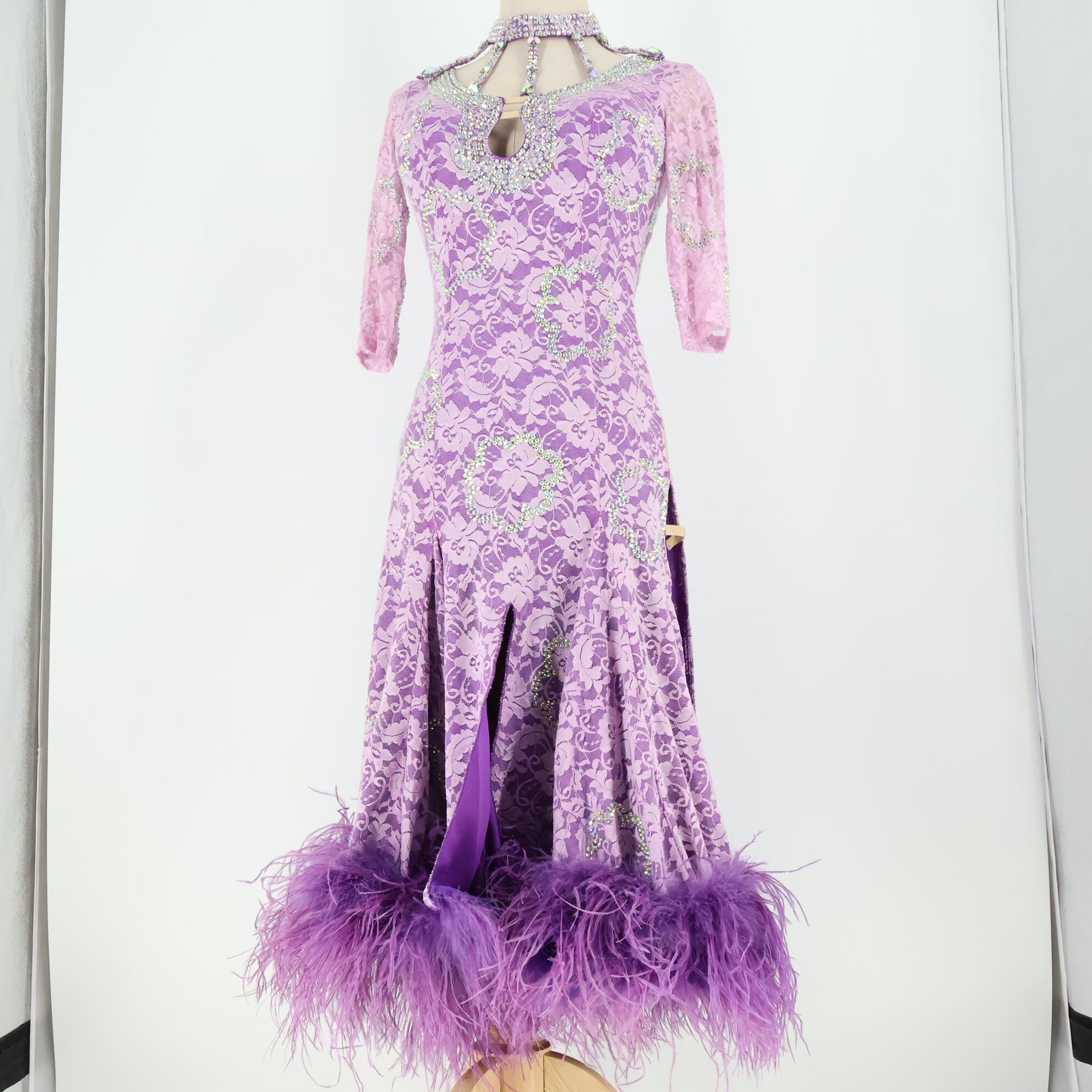 【美品 社交ダンス衣装】パープル ラテン ドレス ワンピース 紫 ファー レース 花柄 上品 高級感 クロッチ デモ 競技用 ピンク スタイル 伸縮性 胸パッド 背面ファスナー ラベンダーカラー レディース