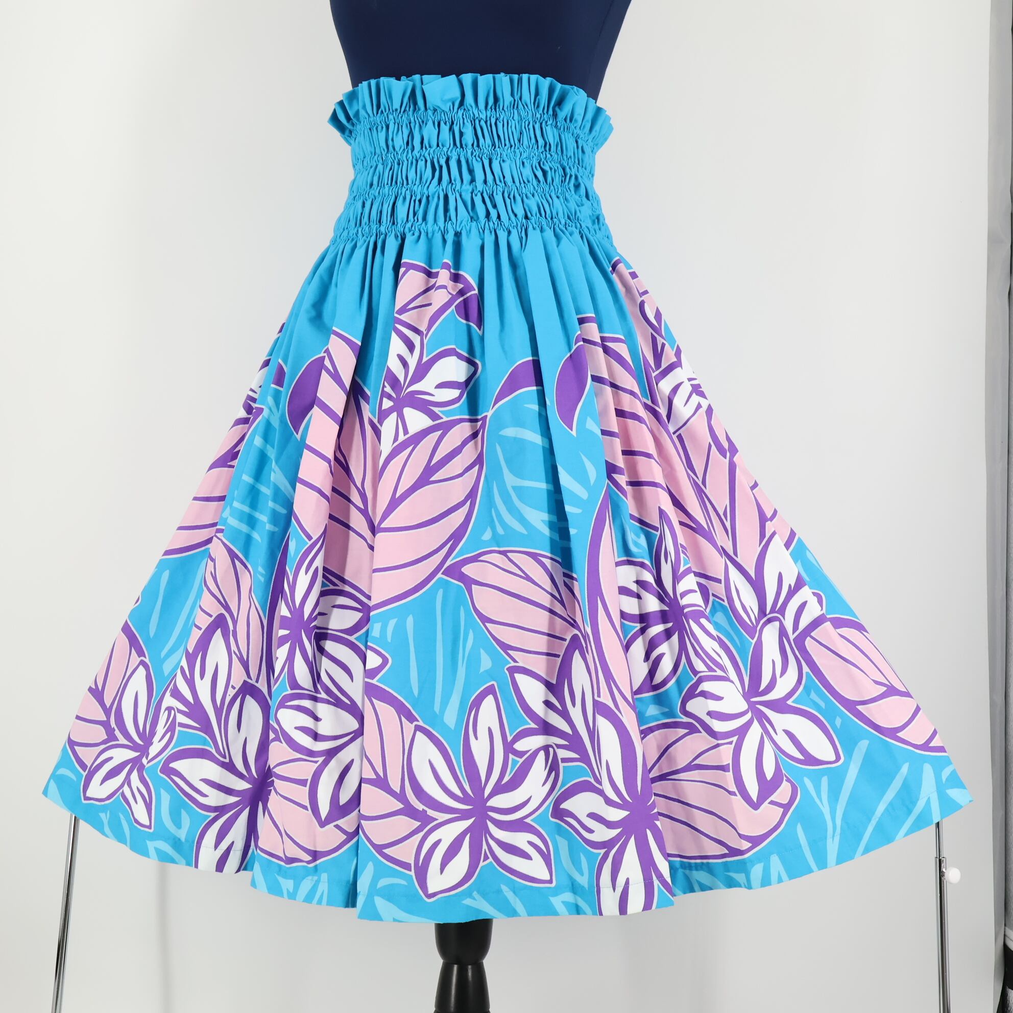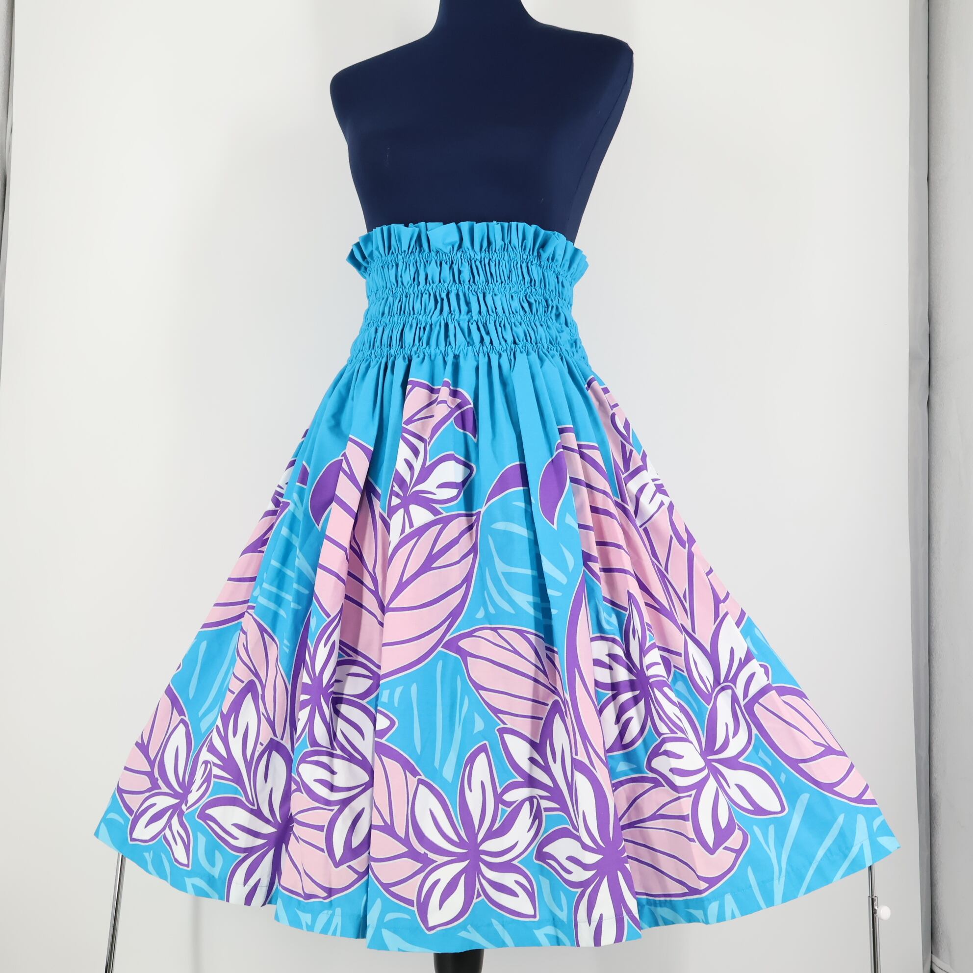 【美品 フラダンス衣装】スカイブルー パウスカート プルメリア柄 花柄 ピンク ホワイト 水色 白 華やか 鮮やか アロハ 可愛い