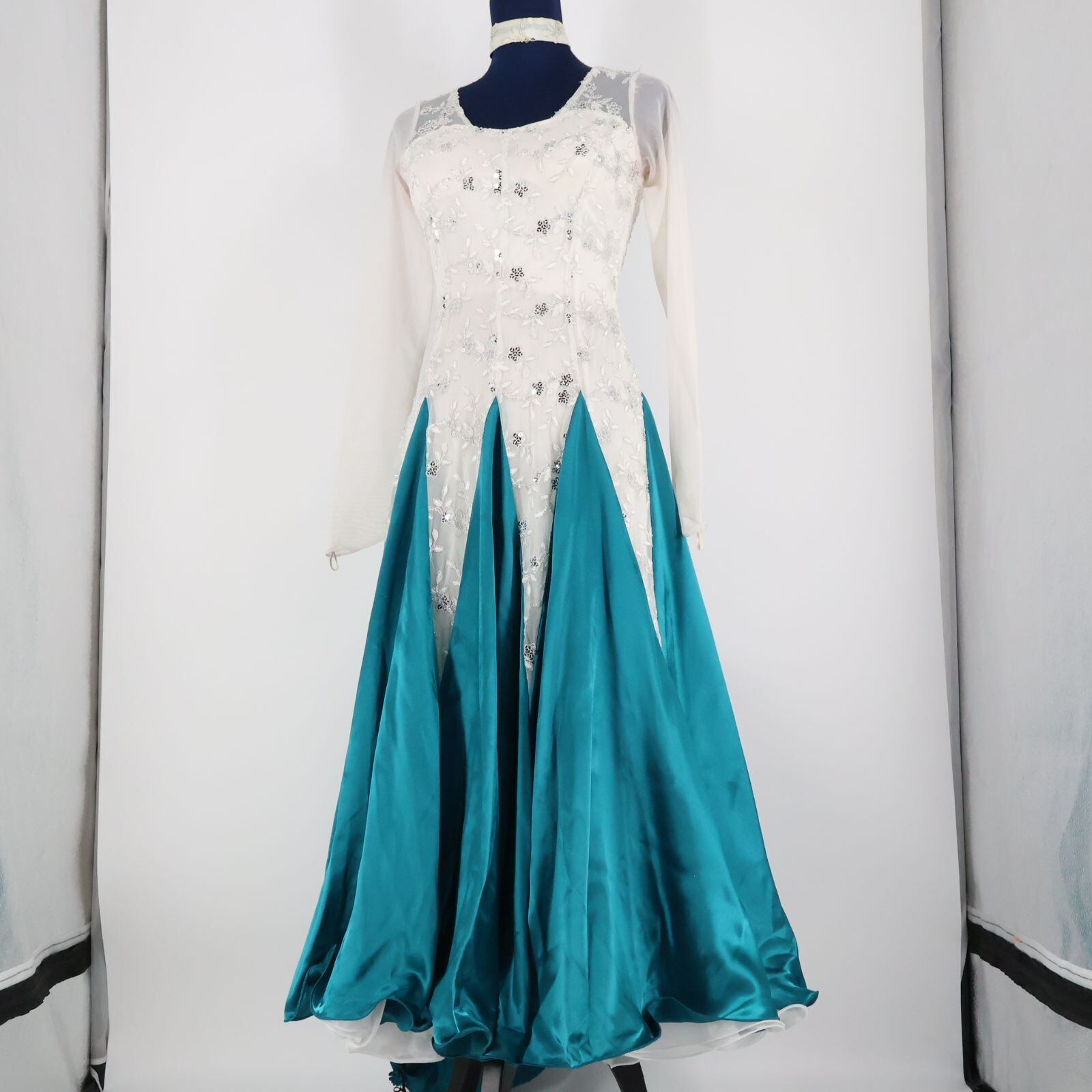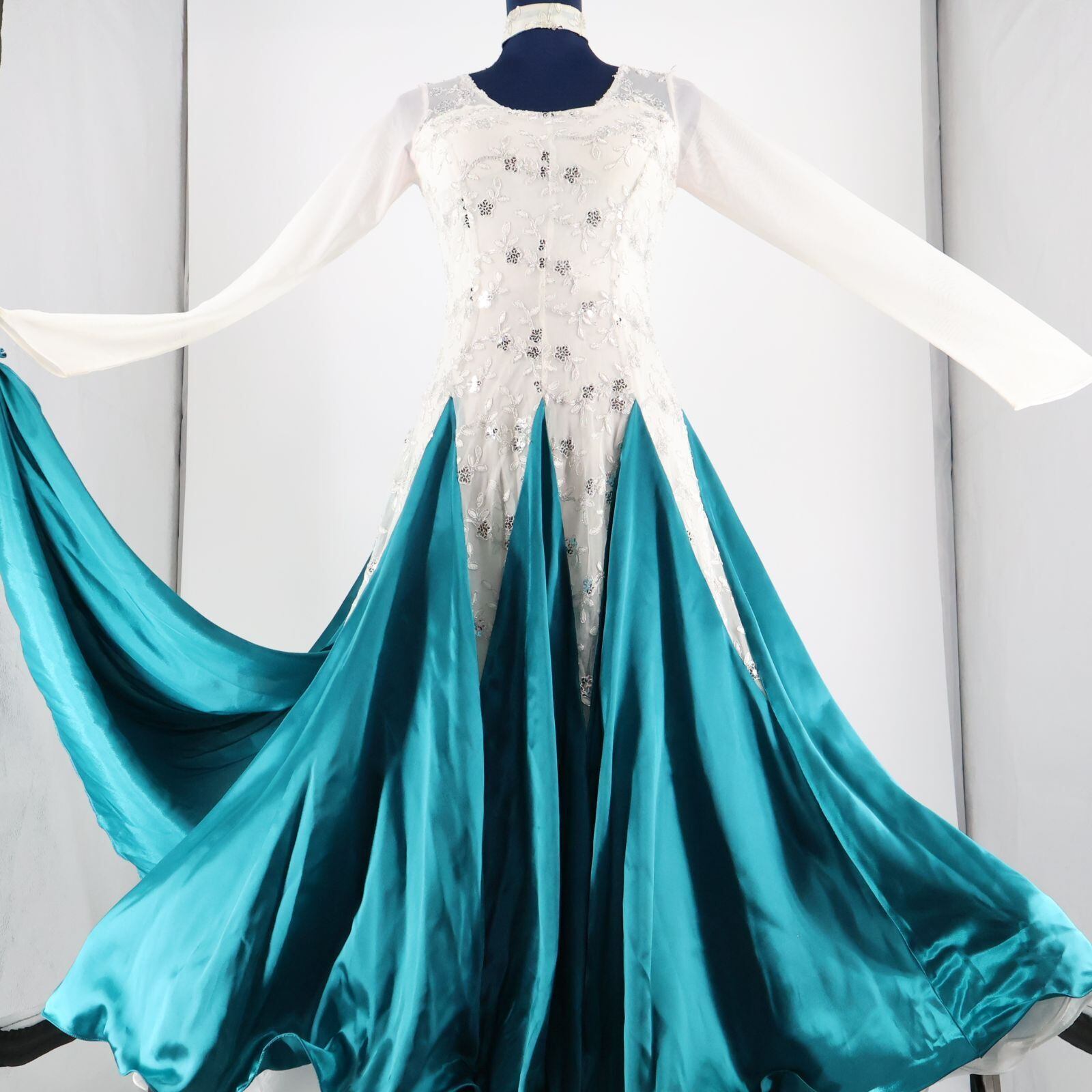#社交ダンス #ダンス衣装 #ワンピース #ドレス #プリマブティック #グリーンブルー #高級感 #光沢生地 #背面ファスナー #サイズM #ファッション #ダンスウェア #ダンススタイル #柔らかい素材 #おしゃれ #エレガント #スタイルアップ #イベント #パーティー #ENUTSU