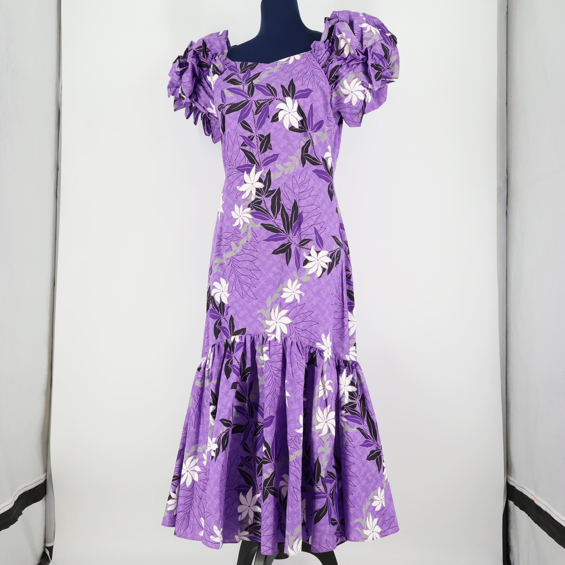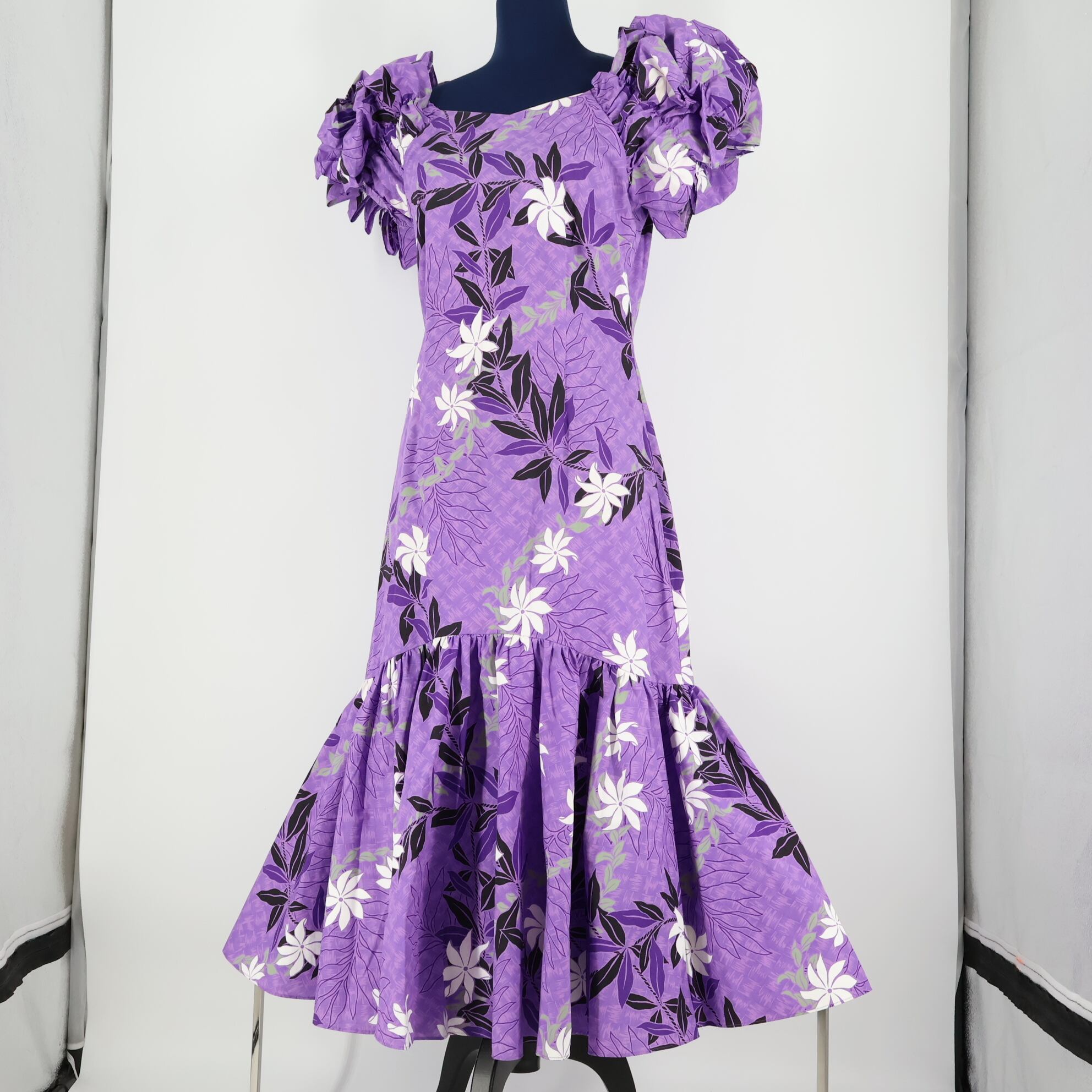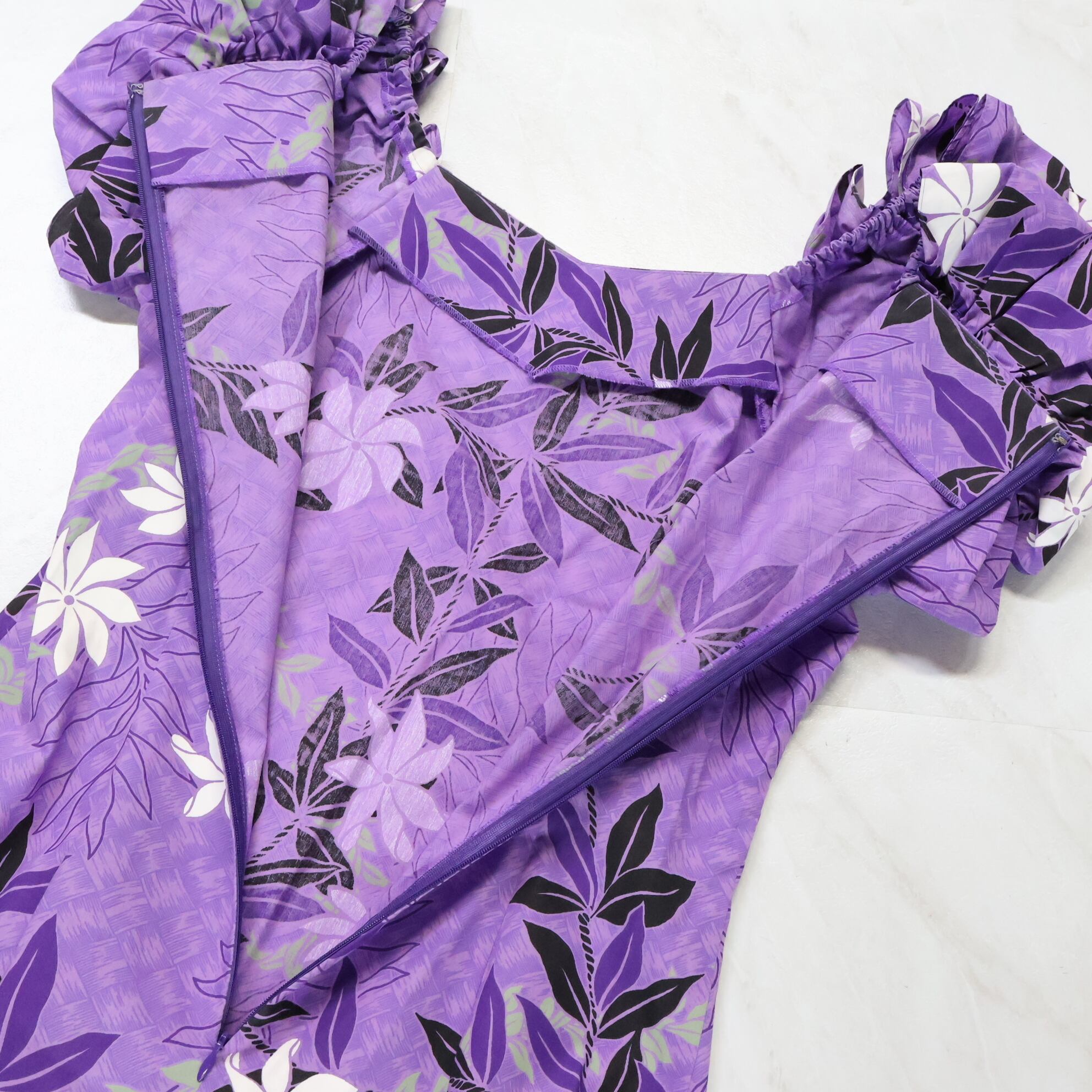 #フラダンス #フラダンス衣装 #ワンピースドレス #ティアレ柄 #紫 #パープル #白 #ホワイト #花柄 #ハワイアンプリント #アロハ #ボリューム袖 #華やか #エレガントスタイル #リゾートコーデ #ダンス衣装 #ダンスコスチューム #ステージ衣装 #古着 #中古 #ENUTSU