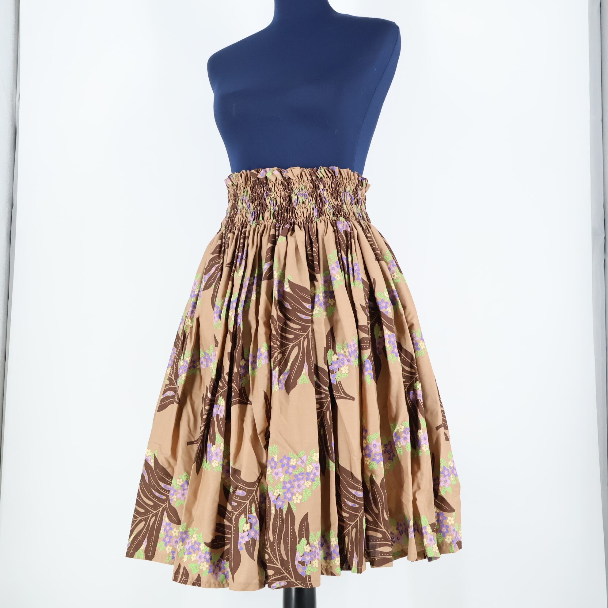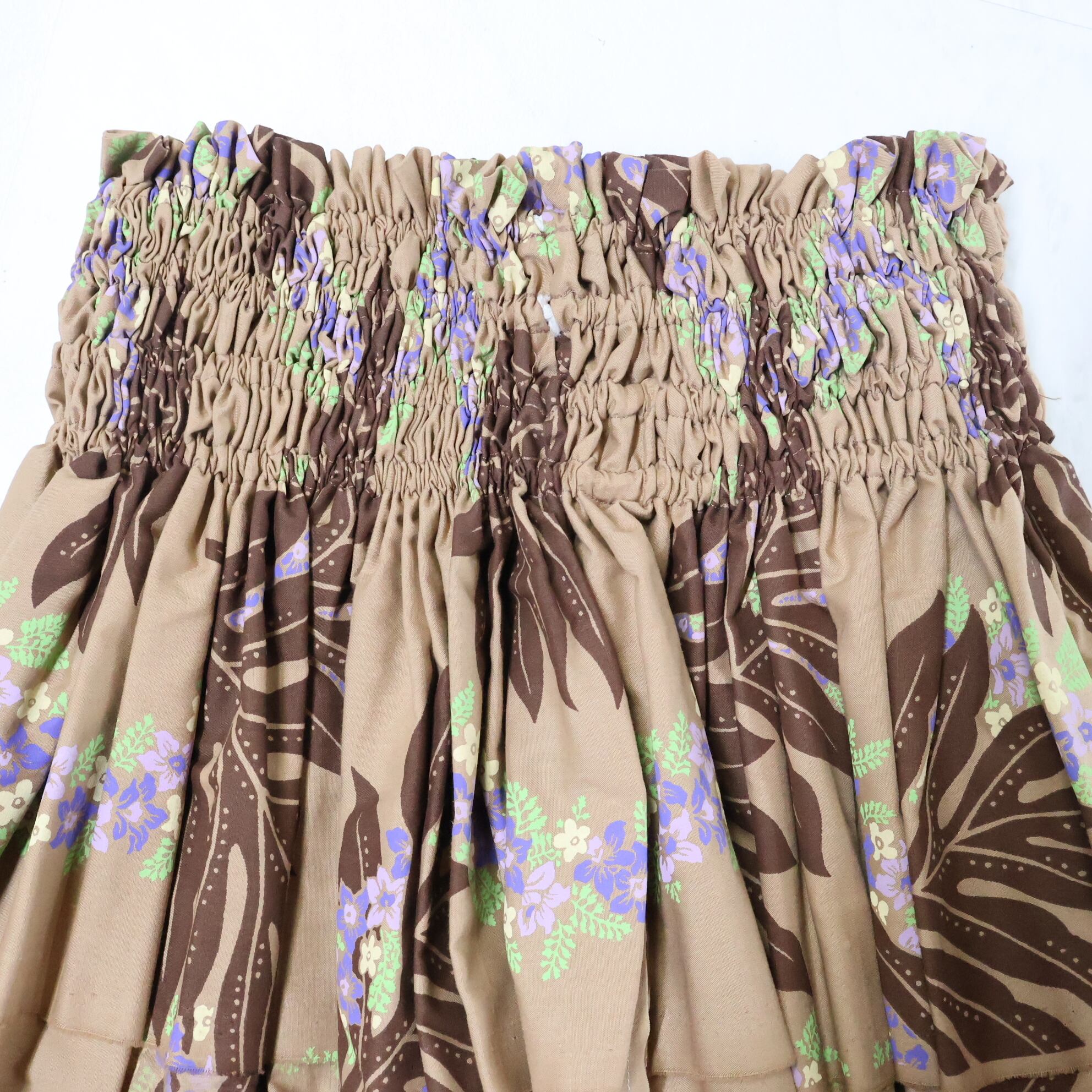 【フラダンス衣装】ブラウン パウスカート 花柄 茶 紫 黄 シャーリング フレアスカート ハワイアンプリント アロハ かわいい