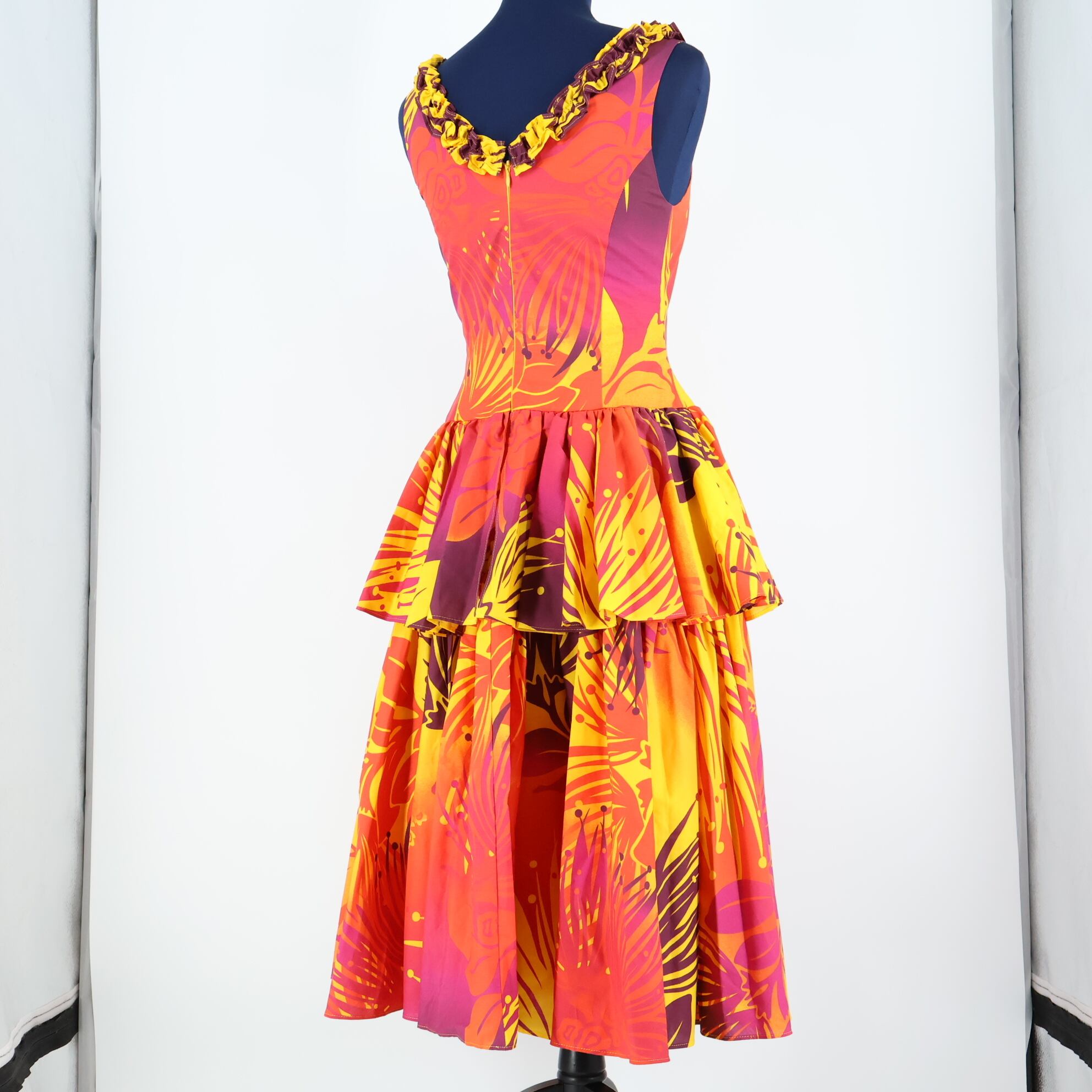 【美品 フラダンス衣装】オレンジ PauskirtShop パウスカートショップ ワンピース ドレス レフア柄 黄 紫 グラデーション