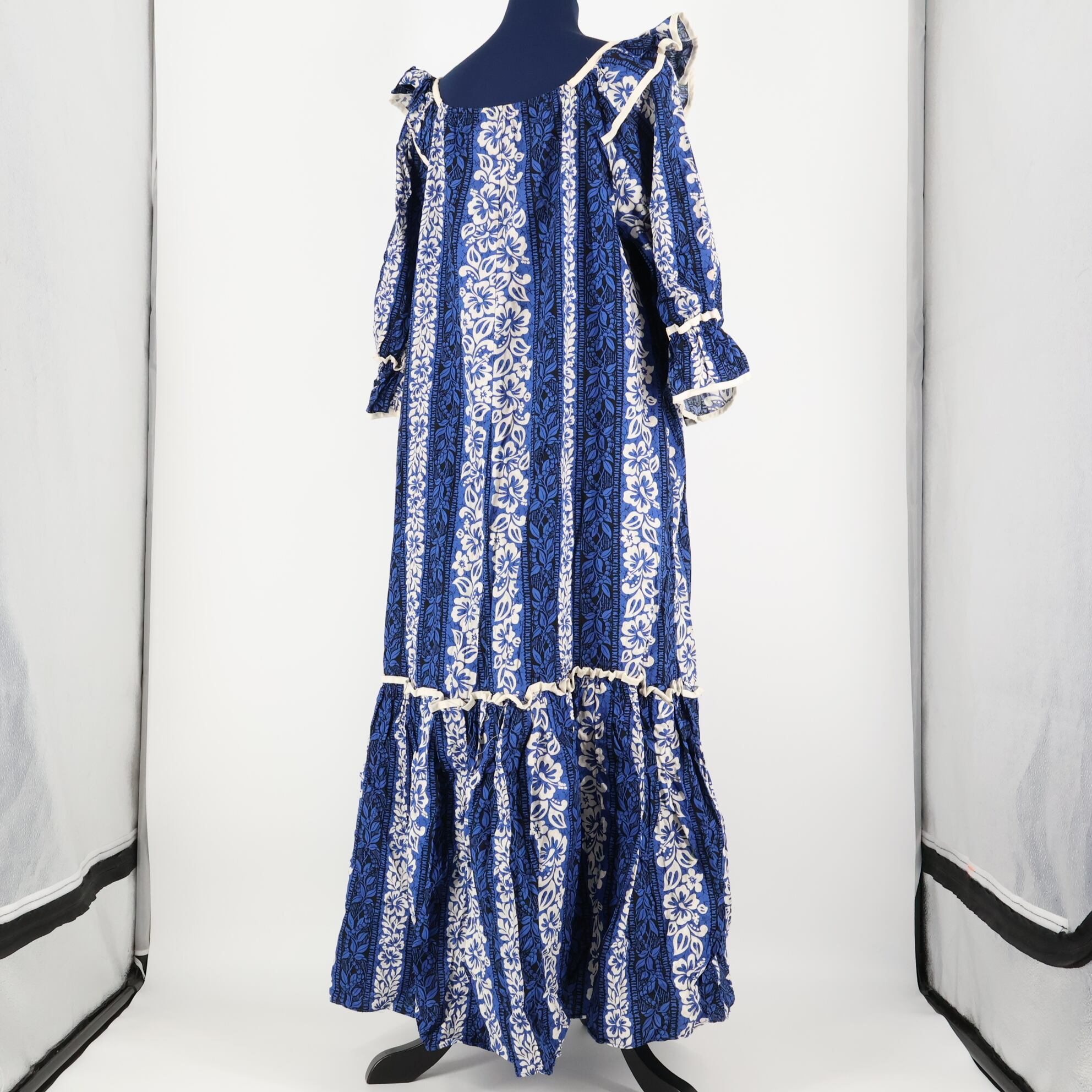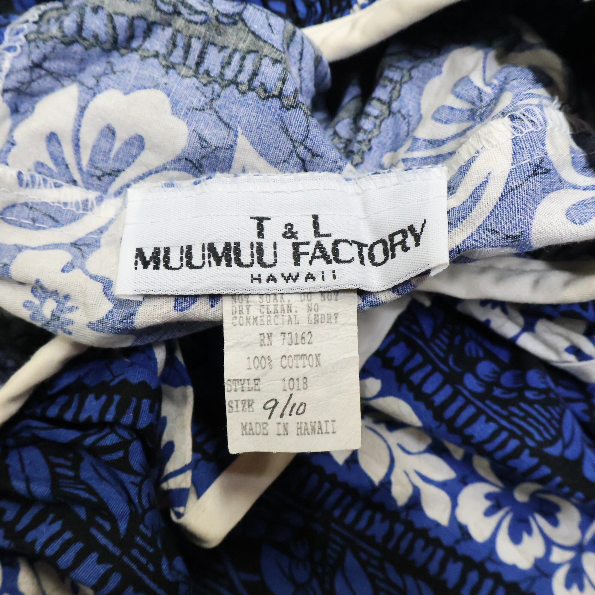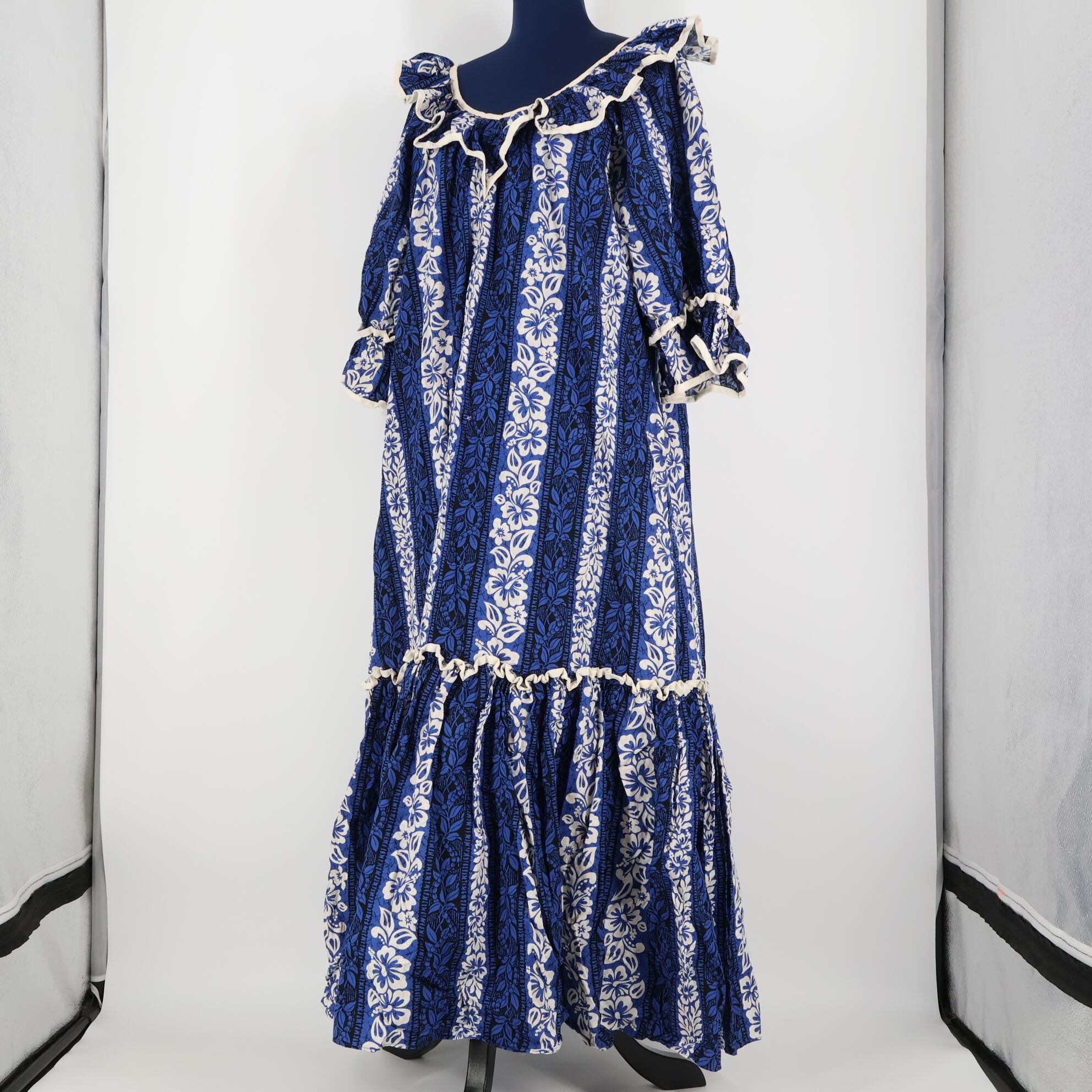 【ハワイ製 フラダンス衣装】ネイビー T&L MUUMUU FACTORY ワンピース ドレス ハイビスカス柄 フリル 白 紺 花柄 かわいい