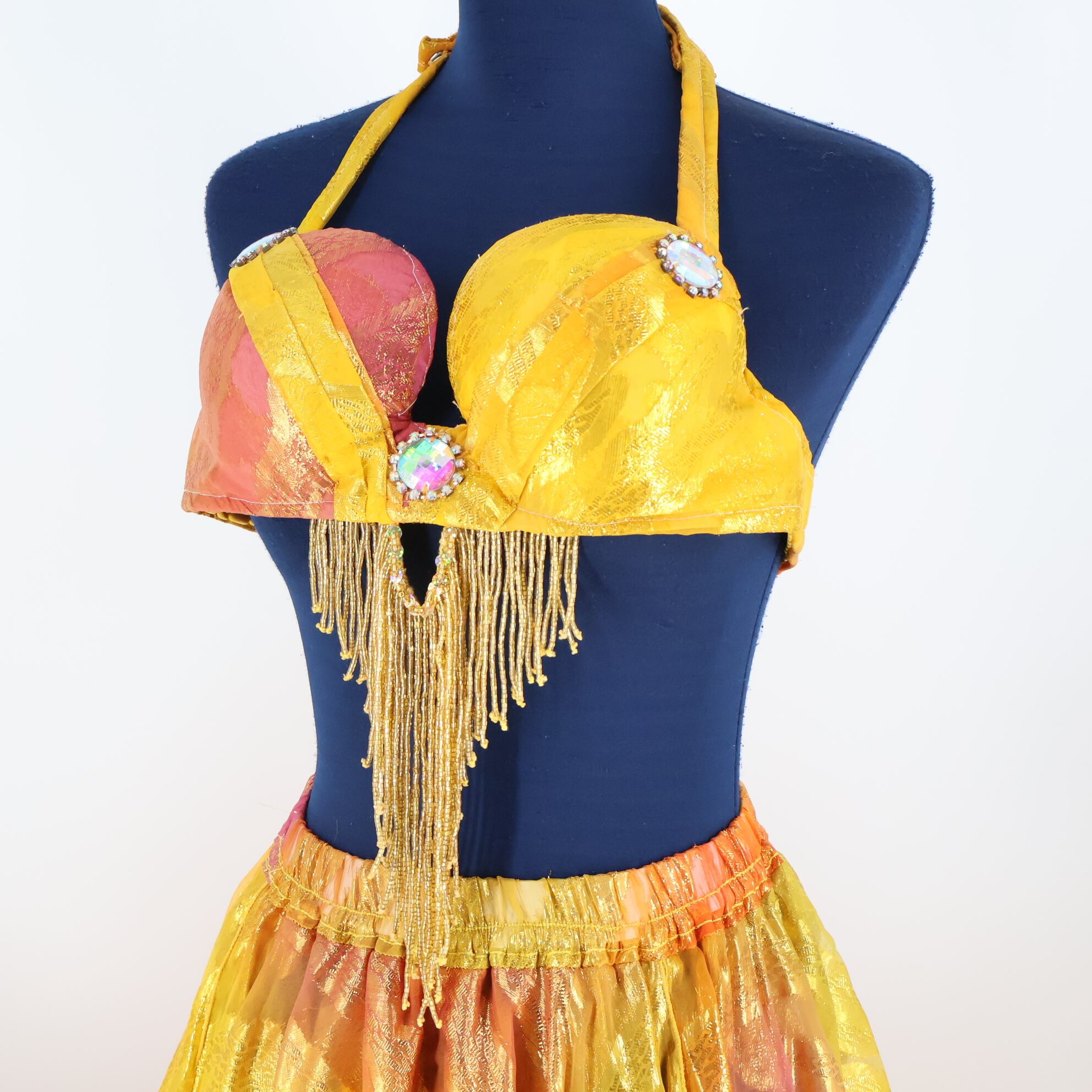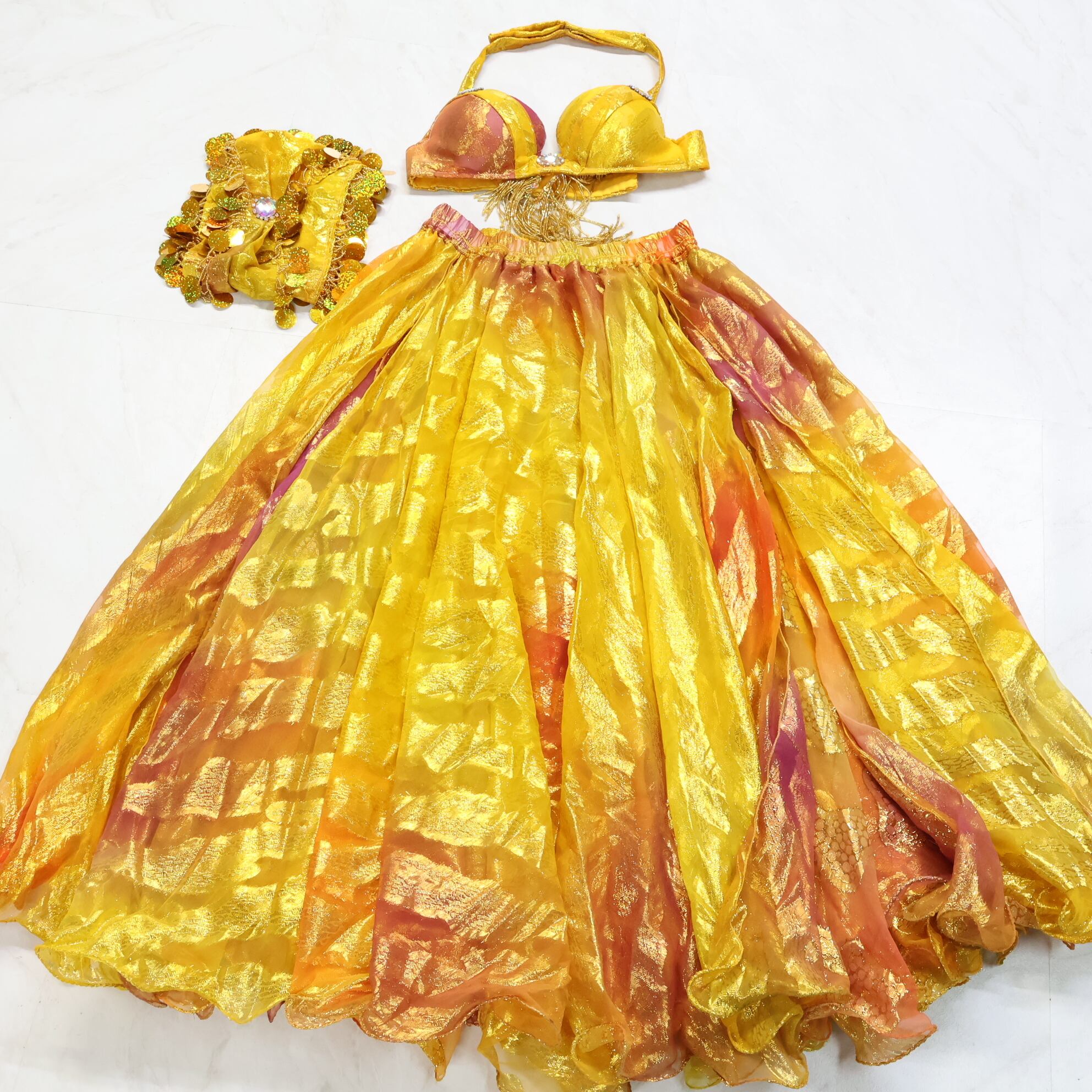 【ベリーダンス用 オリエンタル衣装】オレンジ ラメ ゴールド シルバー 光沢 華やか 豪華 スパンコール 可愛い 目立つ お洒落 トップス セット スカート ヒップスカーフ スリット 伸縮性 ウエストゴム 鮮やか 着心地 良い 派手 目立つ