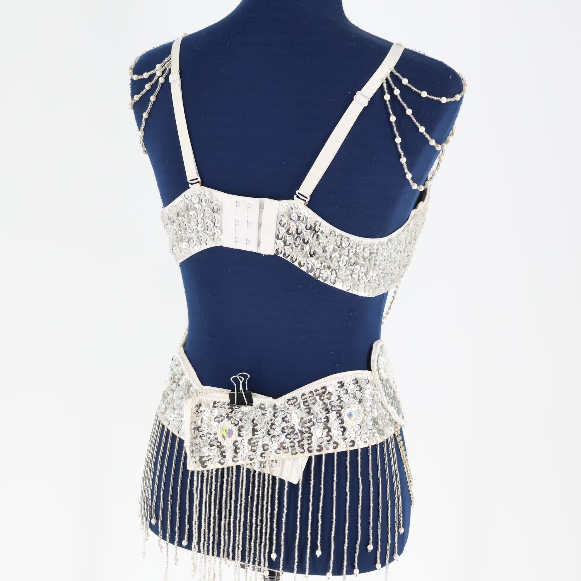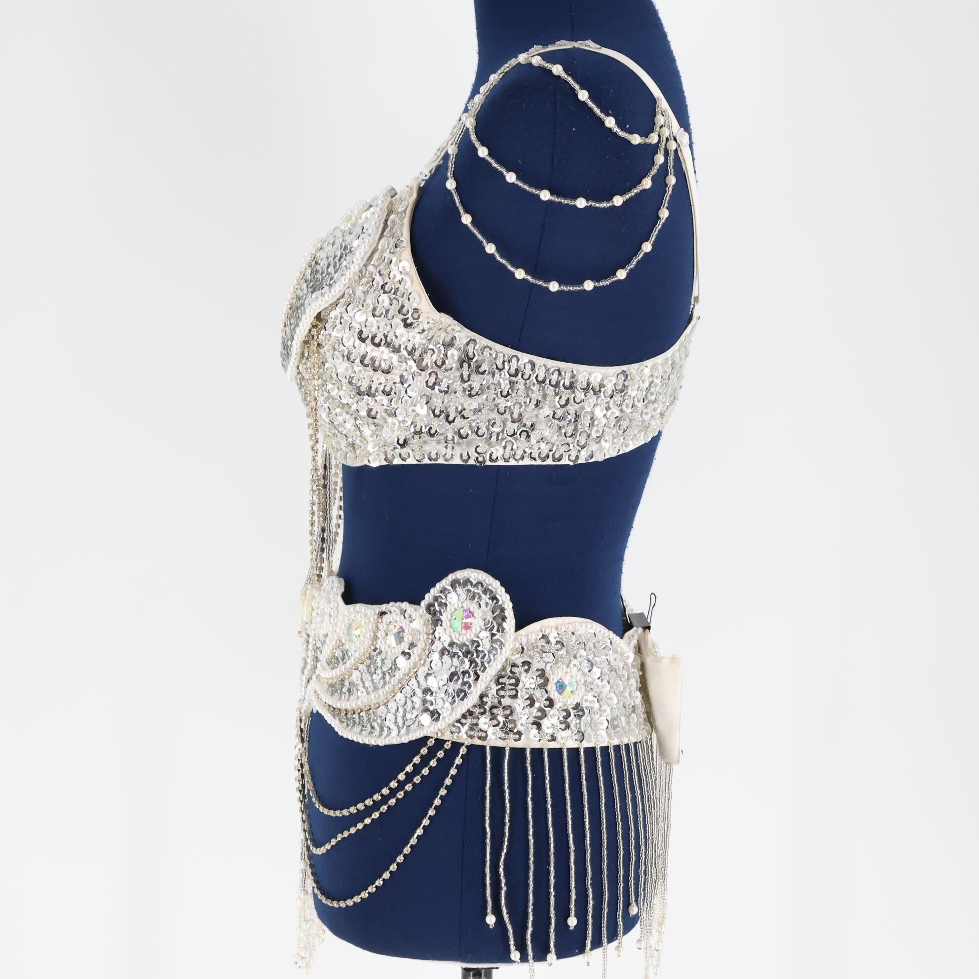 【ベリーダンス用 オリエンタル衣装】シルバー パールビーズ 多数 白 輝き ラメ ゴージャス 輝き お洒落 装飾 豪華 煌びやか トップス ベルト セット スパンコール 衣装 美しい 踊り 舞台 演出 大人用 ダンス衣装