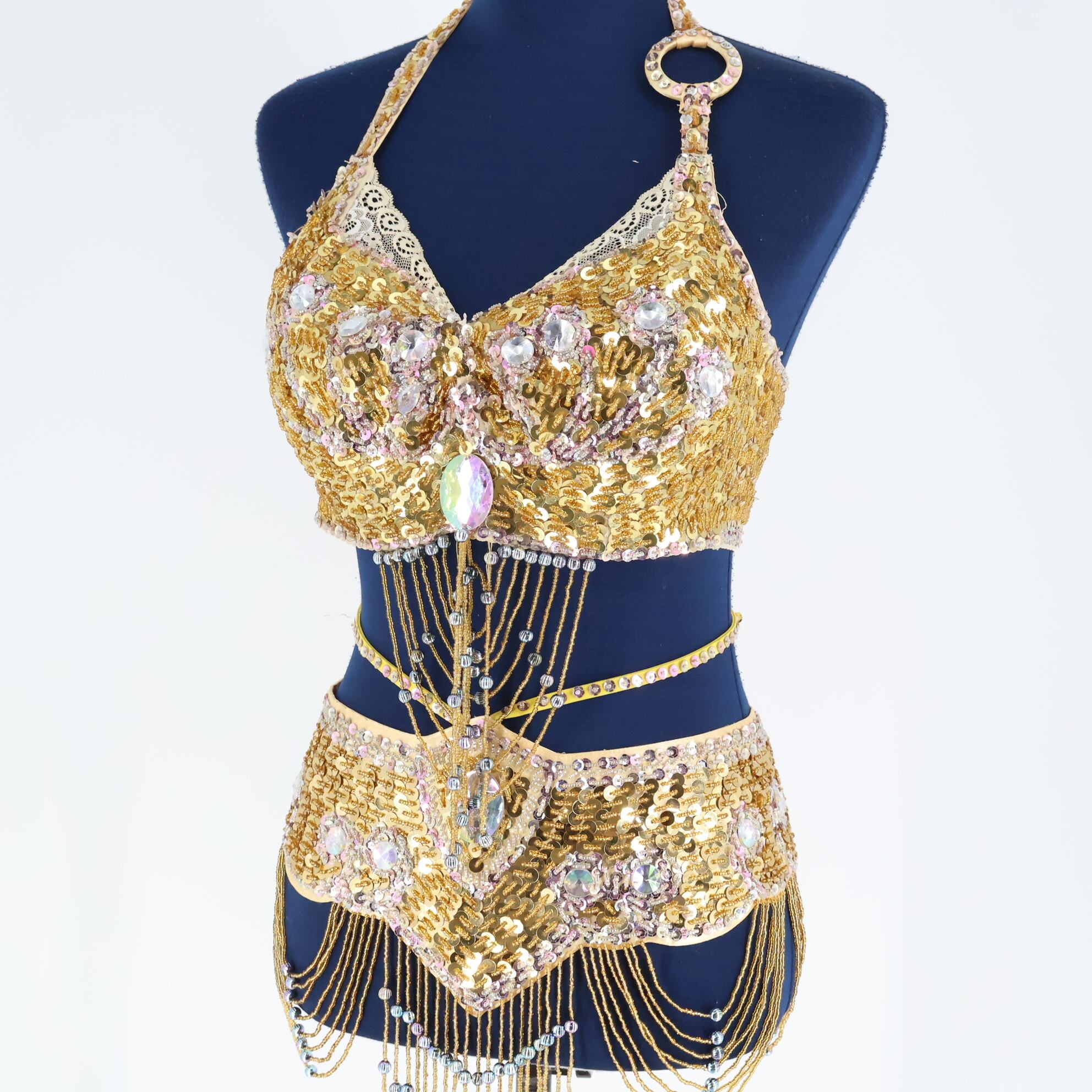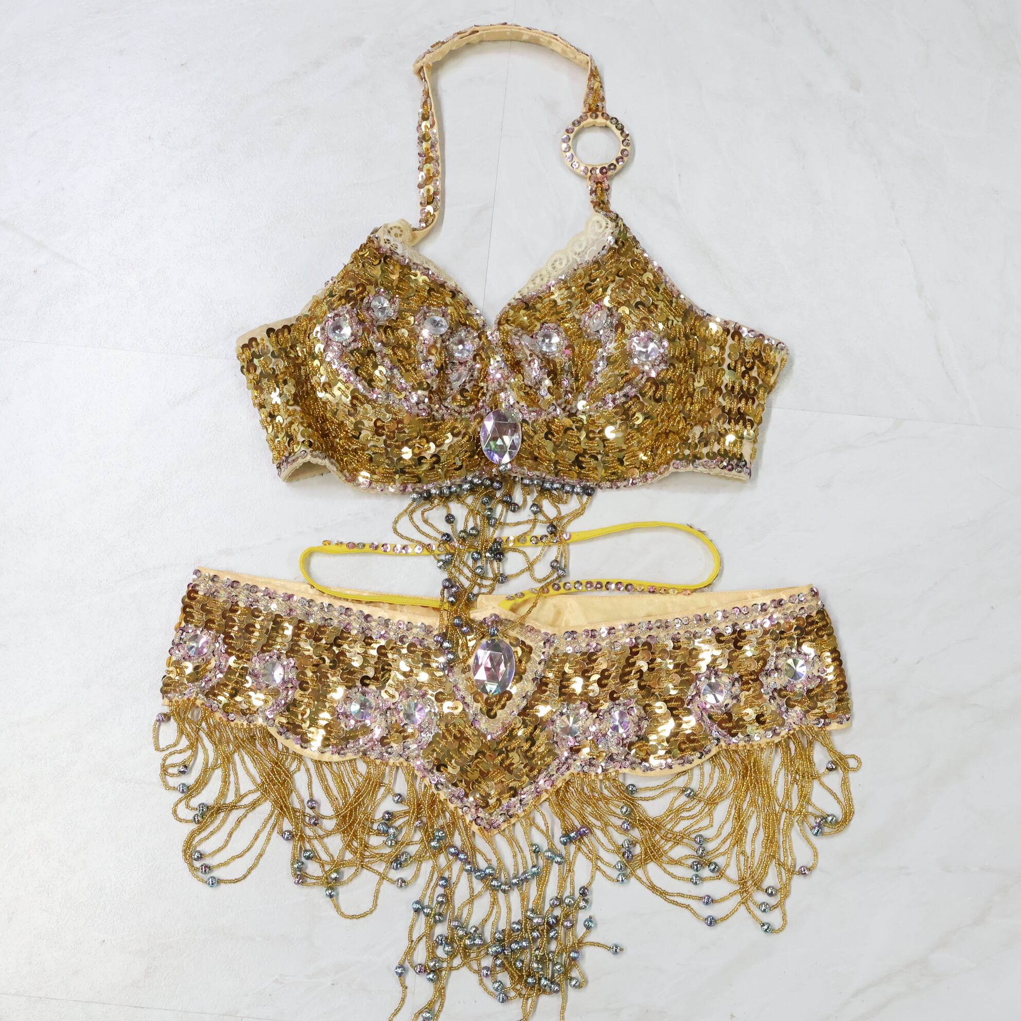 【ベリーダンス用 オリエンタル衣装】ゴールド スパンコールラメ×ビーズ多数 シルバー 輝き ラメ ゴージャス 輝き お洒落 トップス セット ベルト 豪華 衣装 ダンス コスチューム アンダーストラップ 伸縮性 マジックテープ おしゃれ 目立つ 装飾