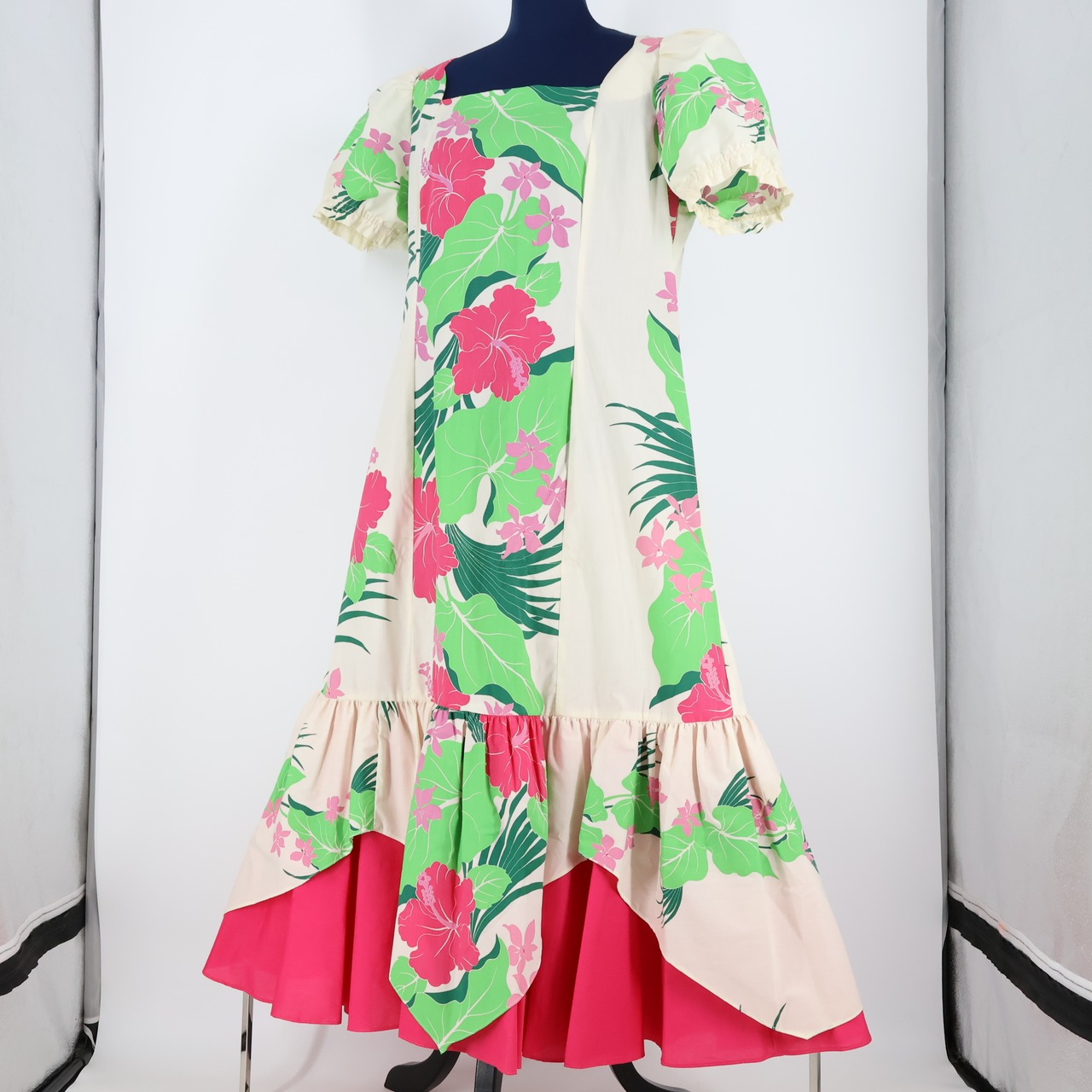 【ハワイ製 フラダンス衣装】ホワイト T&L MUUMUU FACTORY ワンピース ドレス 花柄 ピンク 緑 爽やか 華やか アロハ かわいい