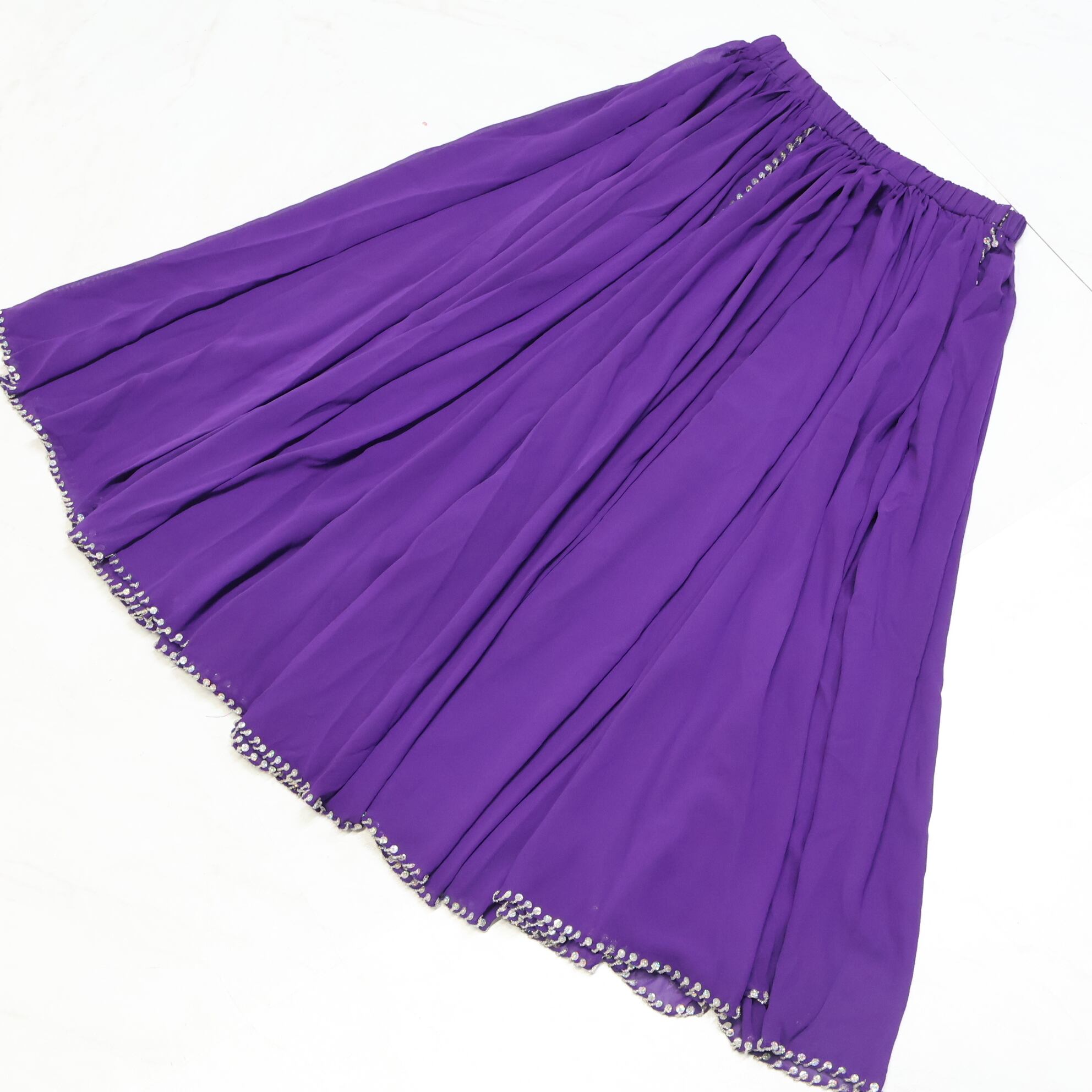 【ベリーダンス用 オリエンタル衣装】パープル スパンコールラメ×ビーズ 多数付き 紫 シルバー ベロア ラメ 華やか 豪華 綺麗 トップス 巻きスカート ベルト アクセサリー セット 伸縮性無し ウエストゴム スリット左右 豪華な装飾 重量感 鮮やかな色合い