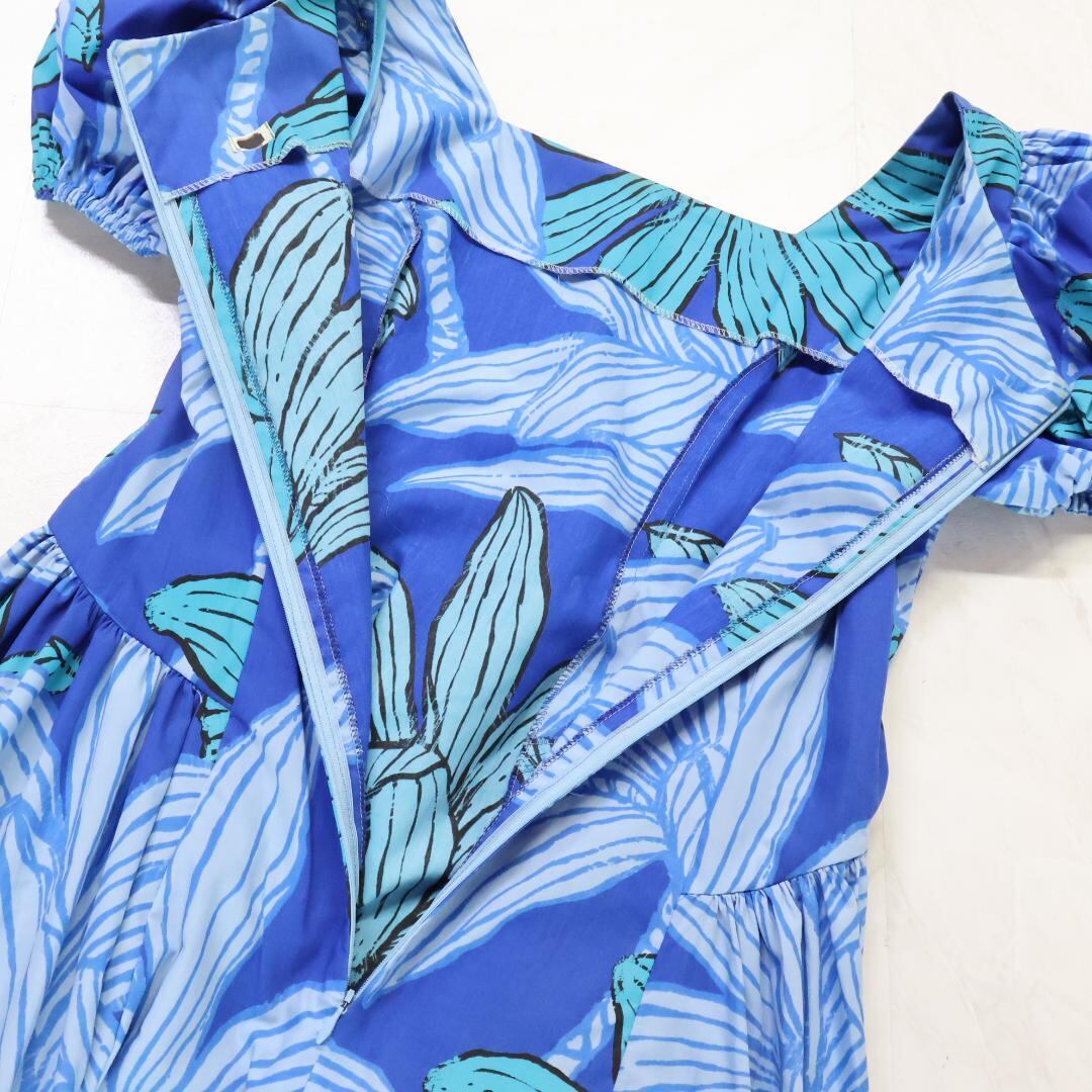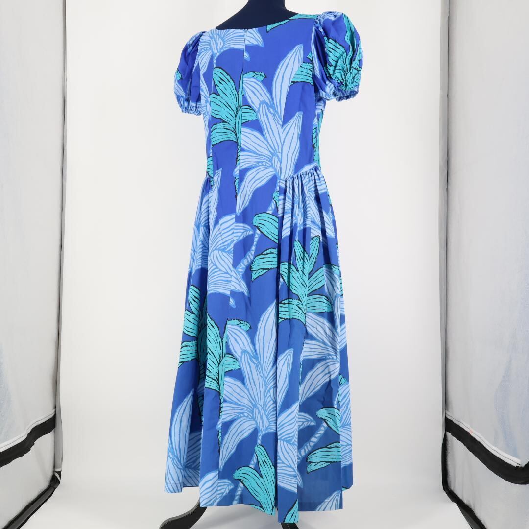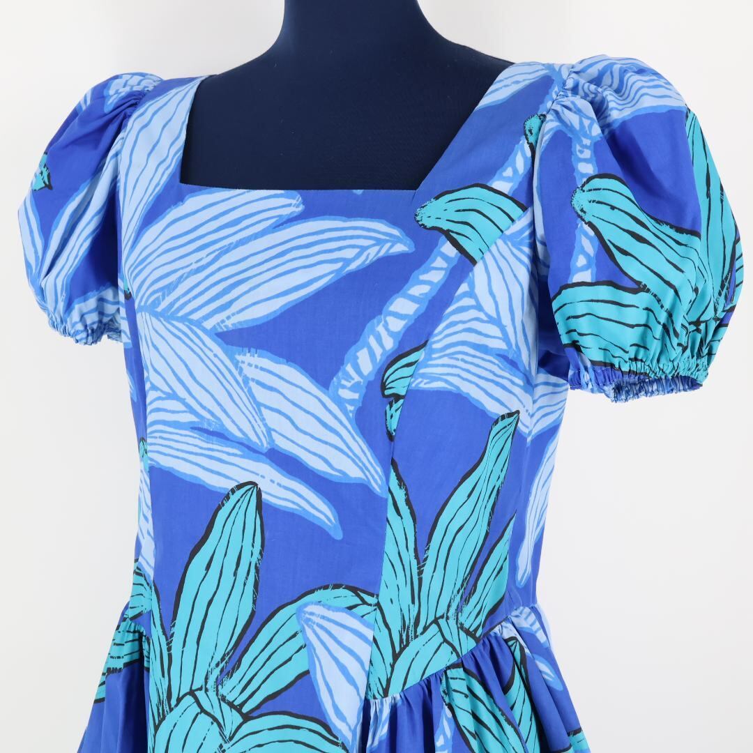 【フラダンス衣装】ブルー ワンピース ドレス グリーン 緑 青 半袖 パフスリーブ 爽やか 鮮やか ハワイアンプリント かわいい