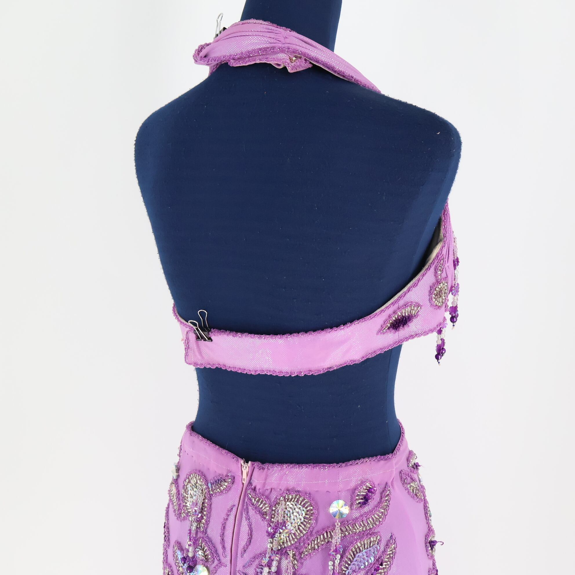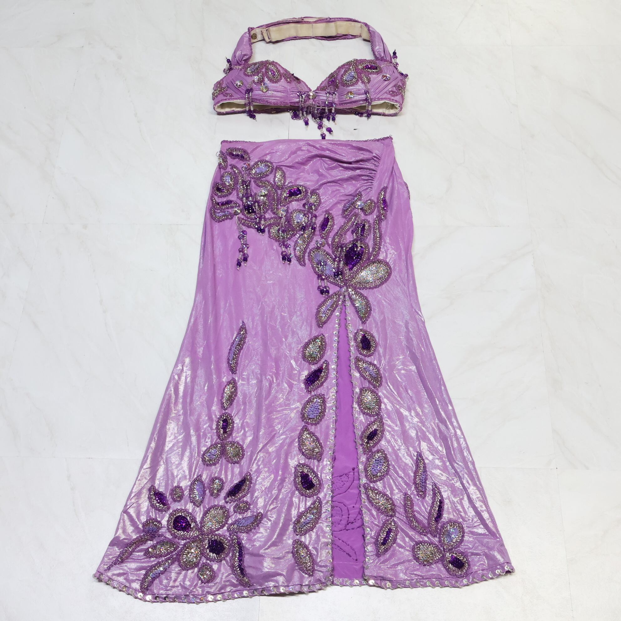【ベリーダンス用 オリエンタル衣装】パープル ビーズ 多数 薄紫 シルバー 花柄 光沢 ラメ 華やか 可愛い スリット ピンク トップス スカート サイズ ゴム ファスナー スリット有り