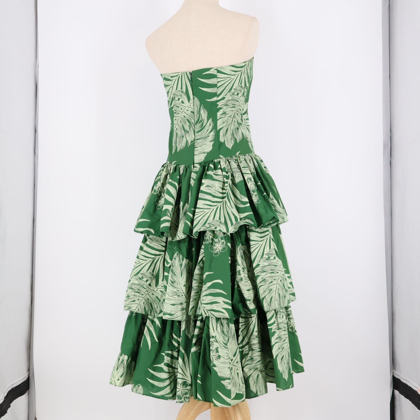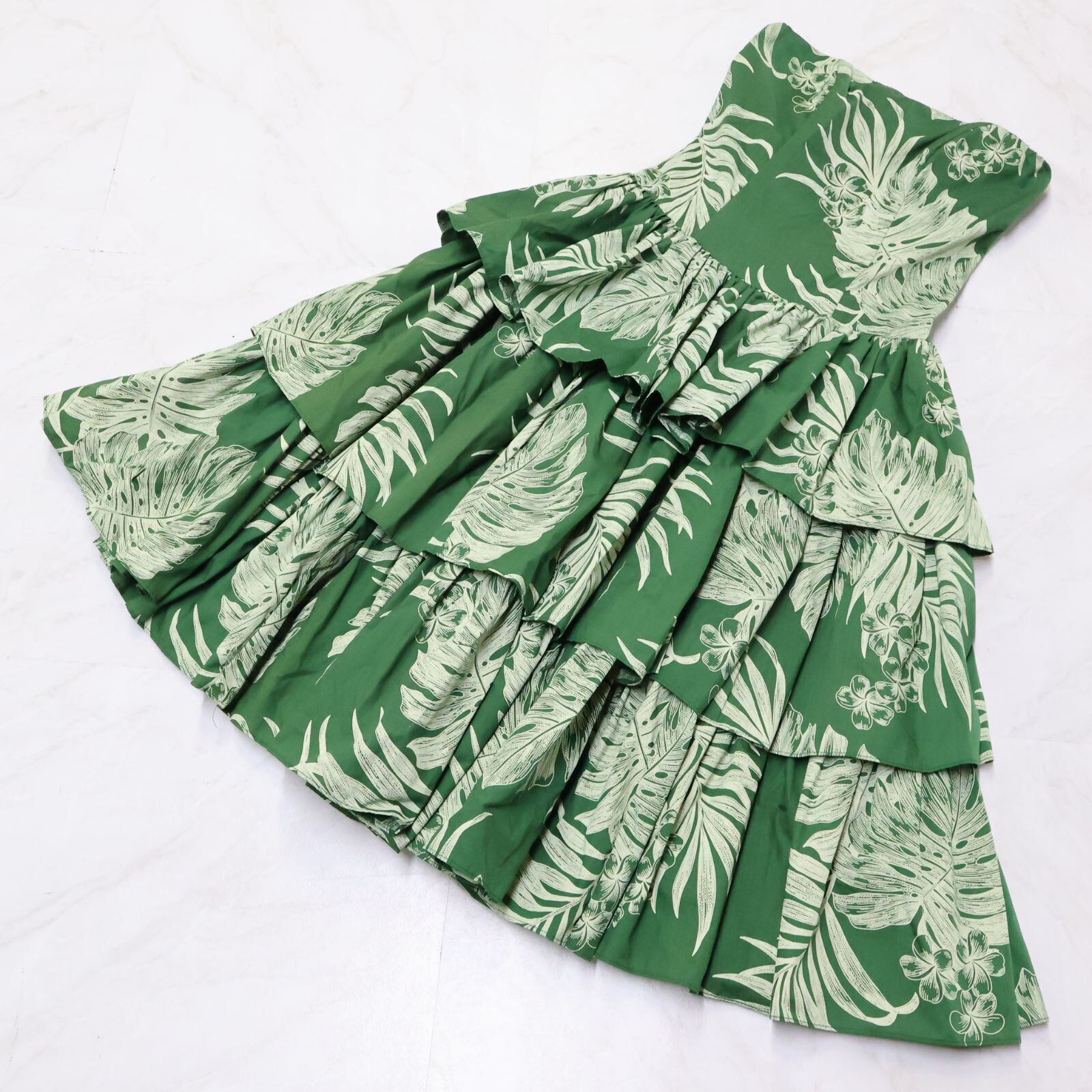 【ハワイ製 フラダンス衣装】グリーン CC Fashions ワンピース ドレス プルメリア柄 モンステラ柄 フリル チューブトップ 緑