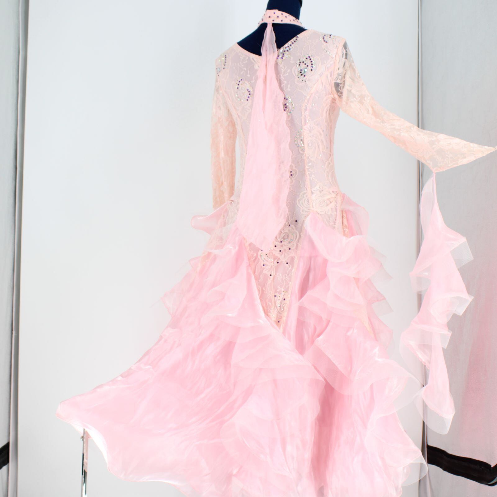 【社交ダンス衣装】ピンク ワンピース ドレス フリル レース かわいい フロート パーティ 発表会 デモ 競技用 花柄 チョーカー
