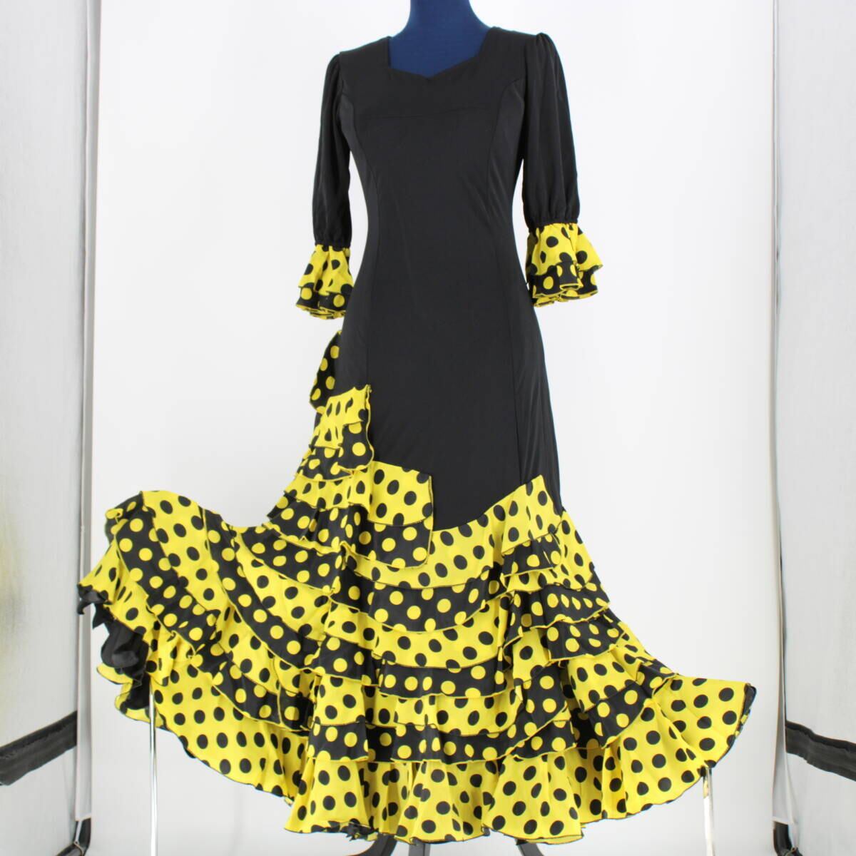 【美品 フラメンコ衣装】ブラック prima boutique プリマブティック ワンピース ドレス 黄色 イエロー ボランテ 水玉 ドット